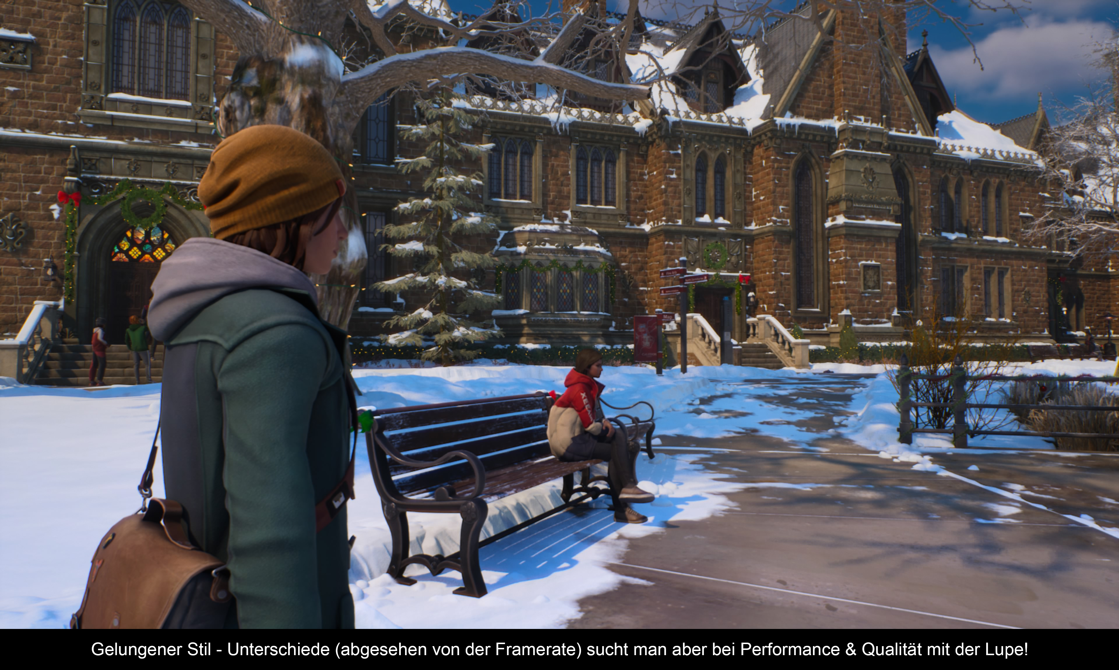Das visuelle Design würde ich als gelungen bezeichnen. Die Optik fällt nicht zu realistisch aus, wirkt aber auch nicht so comicartig wie in „Before the Storm“. Die Figuren wurden gut eingefangen und auch die winterliche Landschaft auf dem Unigelände versprüht eine gewisse Melancholie. Das Wechseln der Zeitlinien wurde ebenfalls gekonnt gelöst und sorgt für einen nahtlosen Übergang zwischen den Welten. Was mir auch ganz gut gefallen hat, war die Gesichtsmimik der Figuren. Zur Auswahl stehen übrigens zwei Anzeigemodi: Performance mit 60fps und Qualität mit 30fps. Letzteres sieht aber nicht wirklich besser aus, ruckelt dank der halben Framerate aber beträchtlich. PS5 Pro Support gibt es übrigens nicht, dafür kann man HDR auch bei Bedarf deaktivieren. Eher negativ fiel das Aliasing (vor allem bei den Umgebungen) auf. Der Sound verfügt dagegen über eine unvorteilhafte Abmischung. Die Sprachausgabe ist eindeutig viel zu laut! Die eigentlichen Sprecher (manche durchaus prominent) machen jedoch einen guten Job. Musikalisch bekommt man in gewohnter Weise einen tollen und umfangreichen Soundtrack geboten. Natürlich auch wieder mit vielen Chill-Momenten, in denen man sich von der Musik verzaubern lassen kann. Die ist übrigens eine nicht zu unterschätzende Konstante der ganzen „Life is Strange“ Reihe. Aber zum Schluss noch ein paar Worte zu Bugs und Fehlern: Die gibt es auch hier, wobei mal ein Dialog nicht deutsch wurde, oder alle Figuren nach dem Zeitlinienwechsel stocksteif in der Gegend standen - nichts Gravierendes, aber vermeidbar.