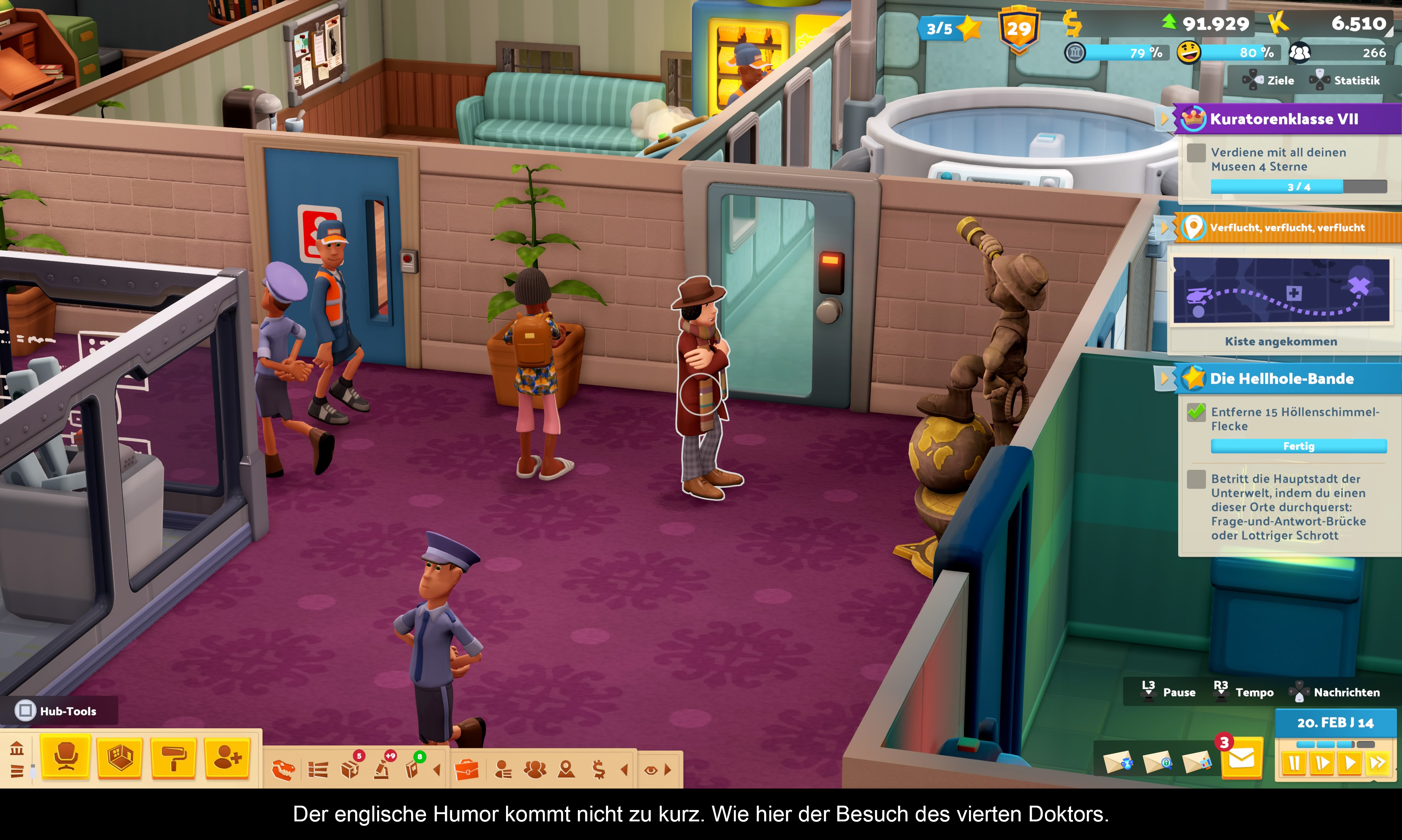 Was die Präsentation betrifft, reiht sich das Spiel nahtlos in die Reihe ein. Bedeutet, dass es abermals kein Grafikbrett ist, aber dank der zahlreichen Exponate konnte man nochmals die Kreativität steigern. Alleine die übernatürlichen Artefakte strotzen vor vielen kleinen Gags, so dass es Lust macht, diese genauer zu betrachten. Was jedoch wirklich zu einem Problem wird, ist die Verlangsamung bei einem voll ausgebauten Museum. Die PS5 kommt, warum auch immer, nicht mit dem Berechnen der zahlreichen Besuchermassen hinterher. Änderungen kann man nur noch vernünftig im Pause-Modus machen, wo das Spiel wieder butterweich läuft. Da kann man nur hoffen, dass dieser Fehler zeitnah behoben wird. Sonst gibt es kaum Negatives zu berichten, da ich in meinen 30 Stunden nur mit einem einzigen Absturz kämpfen musste. Der Rest der technischen Probleme waren Kollisionsabfragen bei der Einrichtung. Nach dem Laden des Spielstands treten diese überraschend häufig auf, lassen sich aber schnell lösen. Akustisch plätschert der Soundtrack ruhig vor sich hin und bleibt vornehmlich im Hintergrund. Die Radiomoderatoren sind dieselben wie bei den Vorgängern, was einerseits gut in die Welt des Two Point Country passt, aber andererseits die gleichen lahmen Gags wie in den Vorgängern gibt. Da wünsche ich mir mehr Abwechslung!