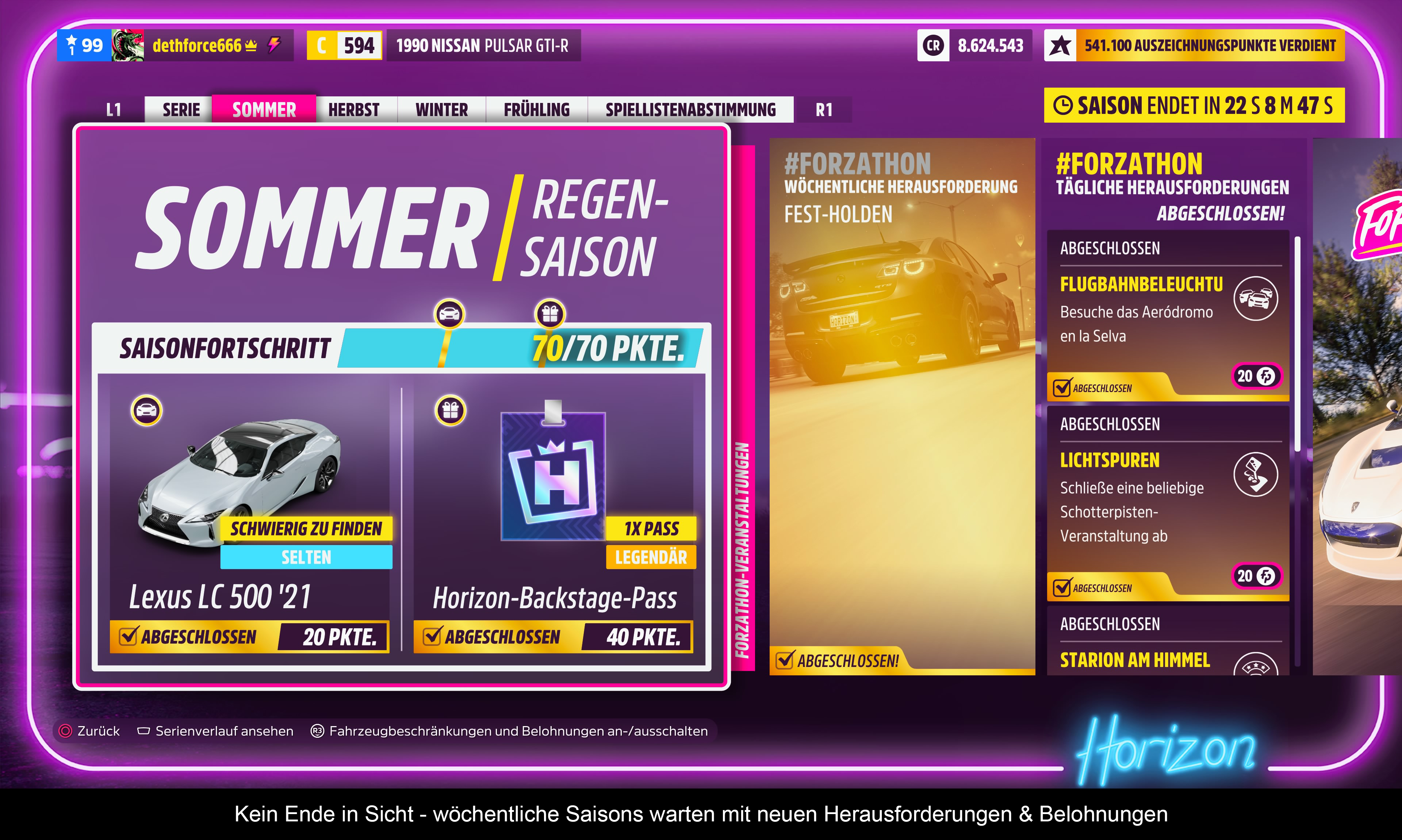 Daneben sind im PSN-Store auch zahlreiche kostenpflichtige Auto-Pakete erhältlich. Diese sind nicht zwingend notwendig, wer jedoch mit neuen GT3-Flitzern, Karren aus der „Fast & Furious“-Kinoserie oder dem originalen KITT fahren möchte, muss 5 bis 10 € investieren. Insgesamt stehen Inhalte aus drei Spielen zur Verfügung, was anfangs auch erschlagend wirken kann. Doch auch abseits davon haben im Laufe der Jahre neue Inhalte Einzug ins Spiel gehalten. Beispielsweise gibt es den brandneuen Musiksender Horizon Wave und die Herausforderungs-Arenen von Horizon Realms. Über den Support konnten sich Xbox-Spieler nicht beschweren. Ob nach dem PlayStation-Release noch viel kommt, bleibt aber fraglich. Die Seasons wiederholen sich zum Beispiel bereits.