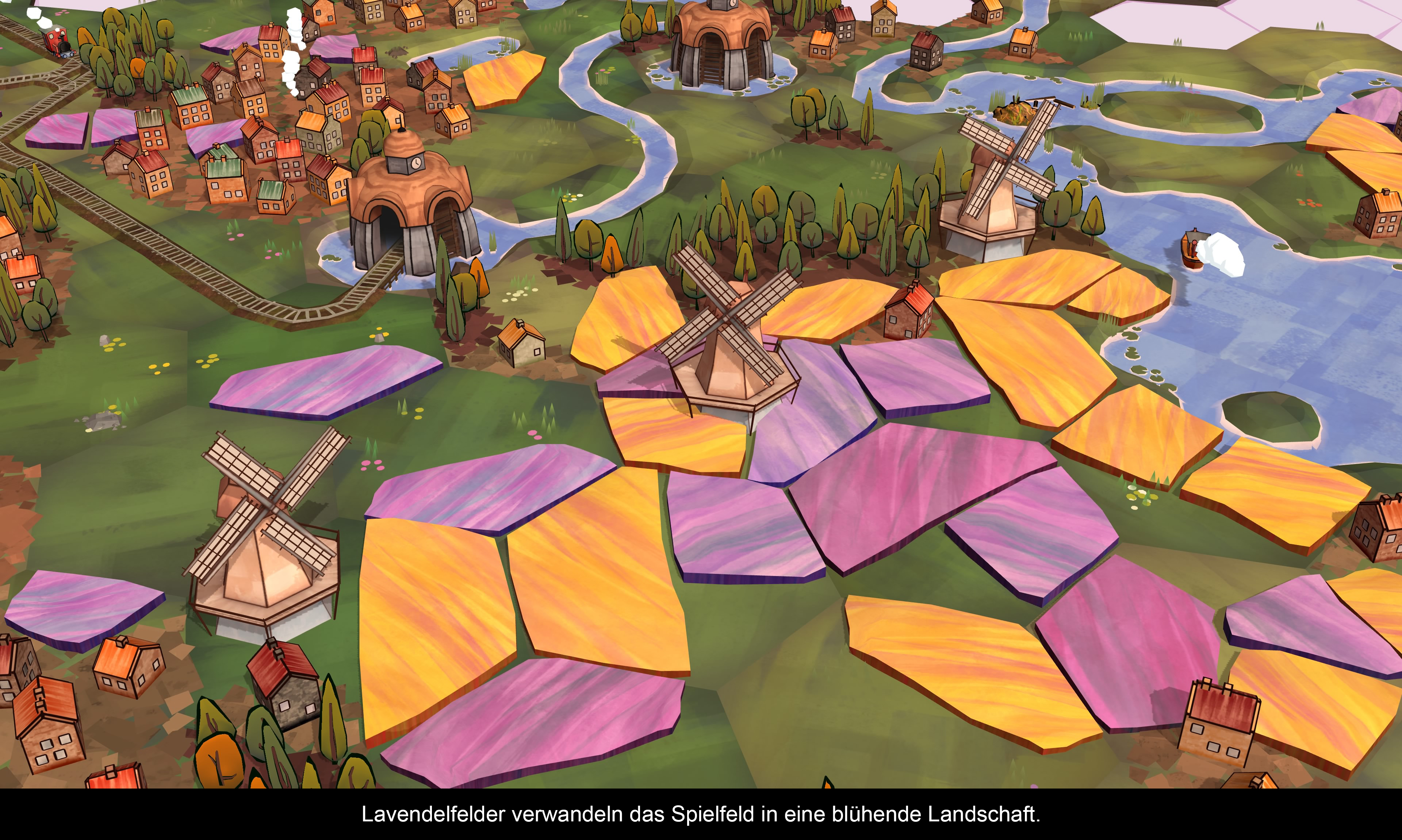 Ein Puzzlespiel muss kein grafischer Brecher sein, sondern sollte immer klar lesbar sein. Der simpel gehaltene Grafikstil unterstützt das perfekt. Ob Häuser, Bäume oder Wiesen – alles hat diesen handgemachten Diorama-Stil und trägt definitiv zum Erfolg des Spiels bei. Dazu kommen liebevolle Animationen, wie die langsam drehende Windmühle, die dampfende Lok auf den Schienen und der kleine Fischkutter. Das macht alles lebendig. Mit der Zeit schaltet man weitere Stile frei und kann das Spielfeld beispielsweise in blühende Lavendelfelder verwandeln oder es im japanischen Stil halten. Musikalisch gibt es ruhige, entschleunigte Musik, die dezent im Hintergrund bleibt. Hin und wieder sind Geräusche zu hören, ebenso das wohltuende Klingeln, wenn man das perfekte Plättchen gelegt hat.