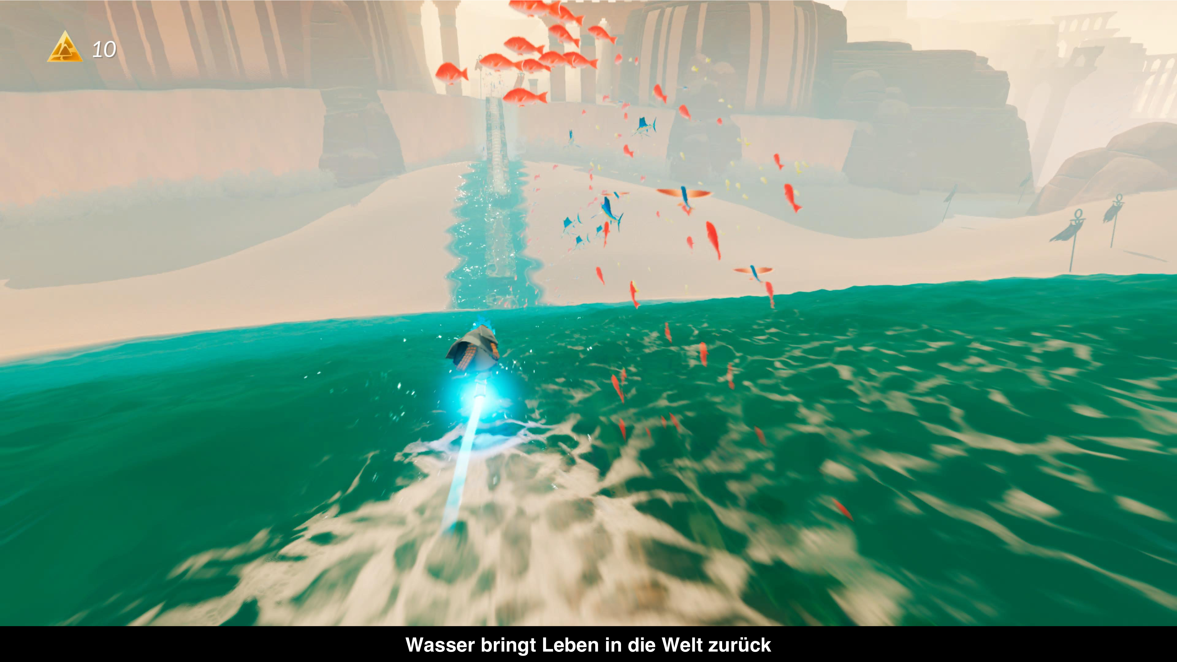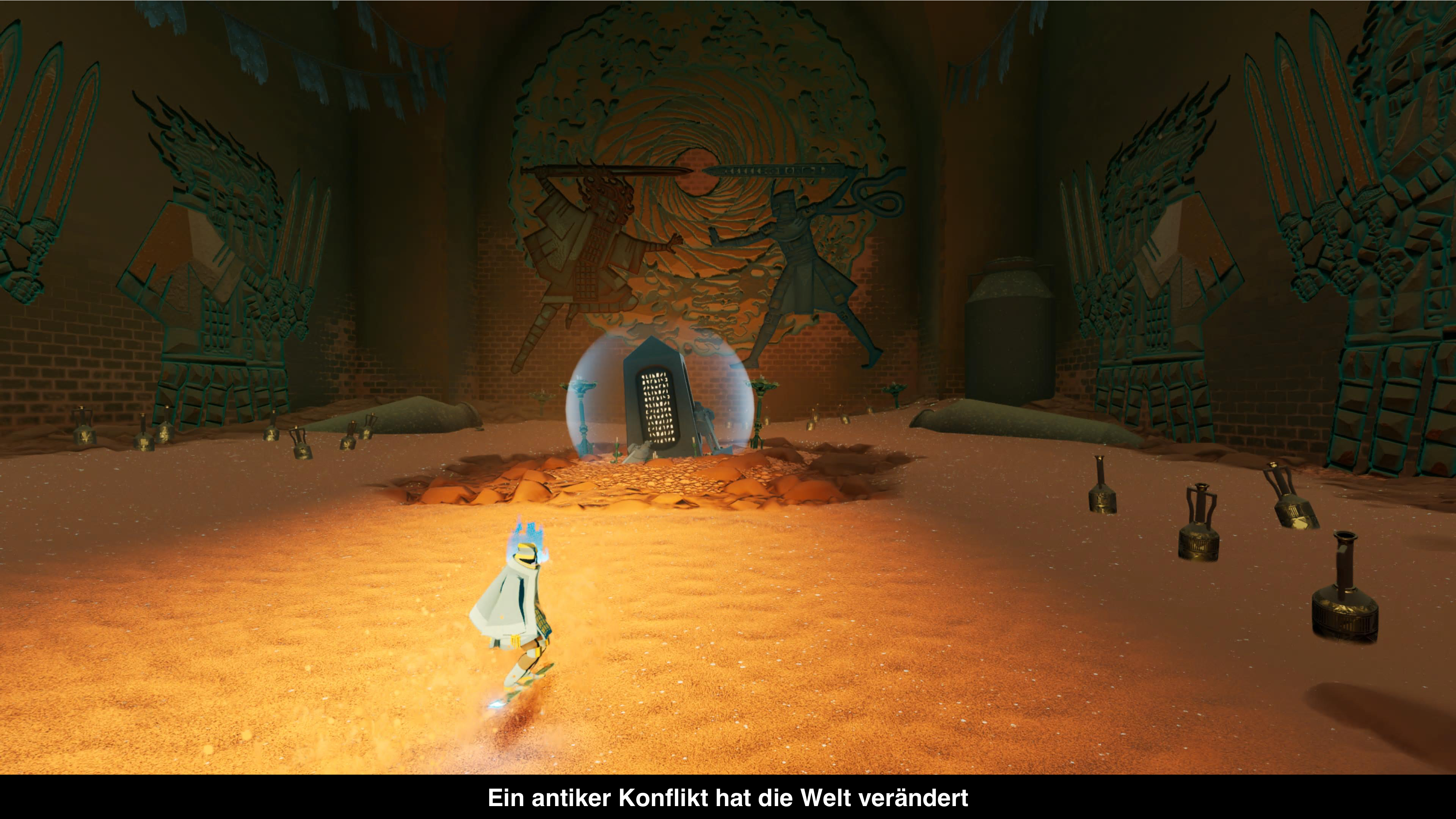 Die Geschichte von Sword of the Sea beginnt damit, dass ein Tropfen Wasser eine Statue zum Leben erweckt. Ihr übernehmt die Kontrolle über dieses Phantom, welches ein Schwert als Hoverboard nutzt und eine scheinbar verlassene Welt erkundet. Nach und nach bringt ihr aber das Wasser zurück in diese Welt und bringt sie erneut zum Blühen. Gleichzeitig lernt ihr langsam mehr über diese Welt, was in ihr vorgefallen ist und welche Rolle ihr möglicherweise darin spielt. Dabei kommt das Spiel ohne irgendwelche gesprochenen Texte aus und nutzt nur die Umgebung, ein paar sehr kurze Zwischensequenzen und Steintafeln. Das funktioniert erstaunlich gut und man möchte durchaus wissen, was als nächstes passiert. Die Geschichte ist aber auch schnell erzählt, wer nicht jedes Geheimnis suchen will, sollte in ca. 2 Stunden die Credits sehen.