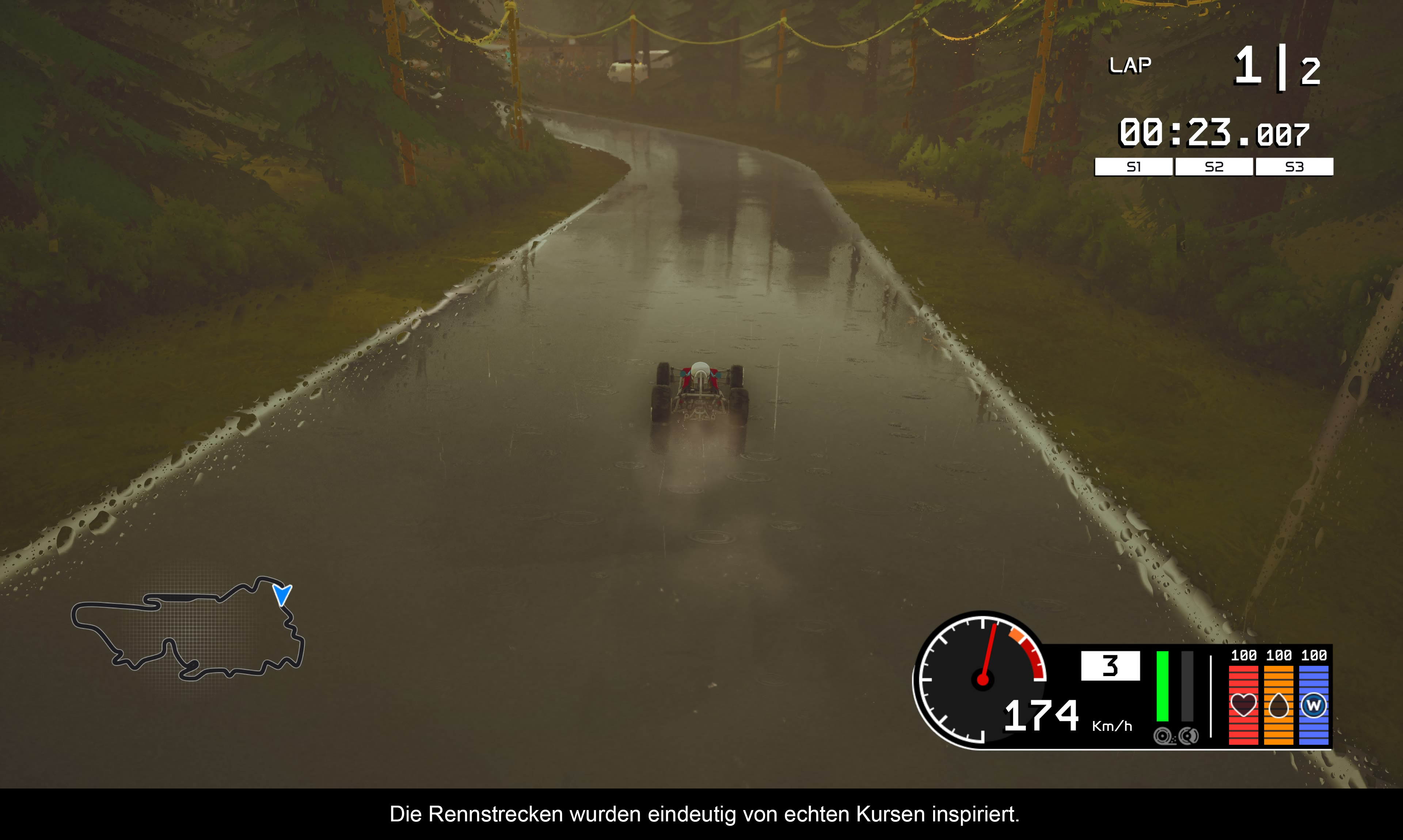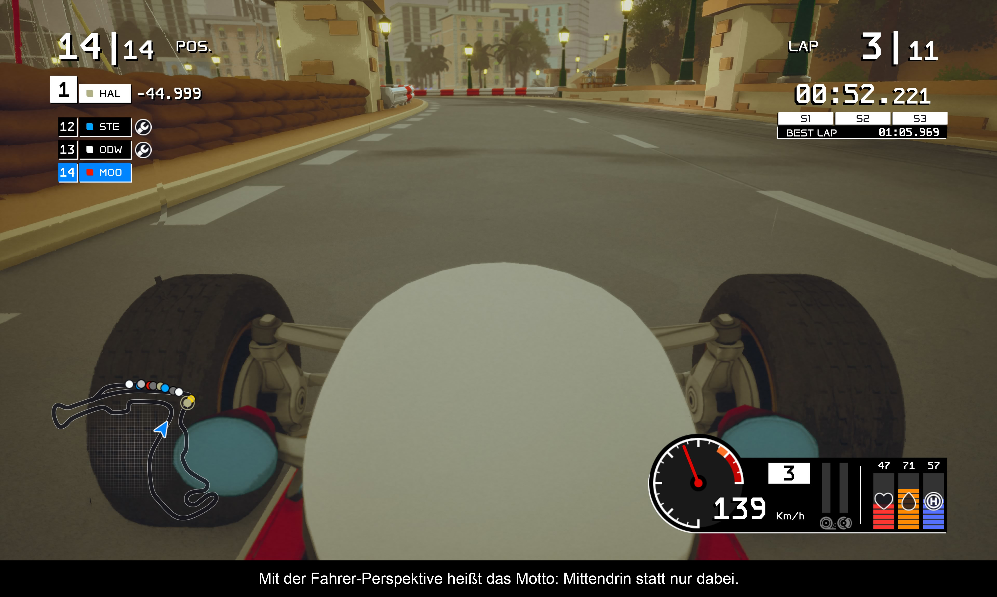 Das Gameplay von Formula Legends zeigt sich deutlich vielschichtiger, als es die erste Optik vermuten lässt. Auf den ersten Blick wirkt der Titel mit seiner farbenfrohen Präsentation, der dynamischen Kameraführung und dem leicht zugänglichen Interface wie ein klassischer Arcade-Racer. Doch schon nach den ersten Runden wird klar, dass die Entwickler einen überraschend hohen Wert auf Realismus gelegt haben. So gilt es nicht nur, die Ideallinie sauber zu fahren und Überholmanöver gut zu timen, sondern auch Faktoren wie den Reifenverschleiß oder den Benzinverbrauch im Auge zu behalten. Hinzu kommt ein detailliertes Schadensmodell, bei dem selbst kleinere Kollisionen spürbare Auswirkungen auf das Fahrverhalten haben und so zu taktischer Vorsicht zwingen. Besonders im Story-Modus zeigt sich dieser Anspruch an Authentizität noch deutlicher, da die technischen Entwicklungen des Motorsports im Lauf der Jahrzehnte greifbar werden. Je weiter man voranschreitet, desto mehr neue Features kommen ins Spiel – ein Höhepunkt ist die Einführung des sogenannten WRS, das klar an das echte DRS angelehnt ist und entscheidende Überholmanöver auf langen Geraden ermöglicht. Diese Einbindung historischer und moderner Renntechnologien verleiht den Rennen zusätzliche Tiefe und spiegelt die Evolution des Sports auf gelungene Weise wider. Trotz all dieser Details haftet dem Spiel jedoch ein Problem an, das nur schwer zu übersehen ist: das allgemeine Lenk- und Fahrverhalten. Wo der Rest des Spiels mit großer Liebe zum Detail und durchdachten Mechaniken glänzt, fühlt sich die Steuerung oft schwammig und unpräzise an. Besonders in engen Kurven verliert man schnell die Kontrolle, was häufig dazu führt, dass man eher über die Strecke „schwimmt“ als präzise fährt. Zur Frustration trägt außerdem bei, dass die gegnerische KI nahezu fehlerfrei agiert und kaum Schwächen zeigt. Während man selbst durch die Trägheit der Steuerung regelmäßig ins Straucheln gerät, nutzen die KI-Fahrer die Schwächen gnadenlos aus – ein Ungleichgewicht, das man im Laufe der Karriere immer deutlicher spürt.