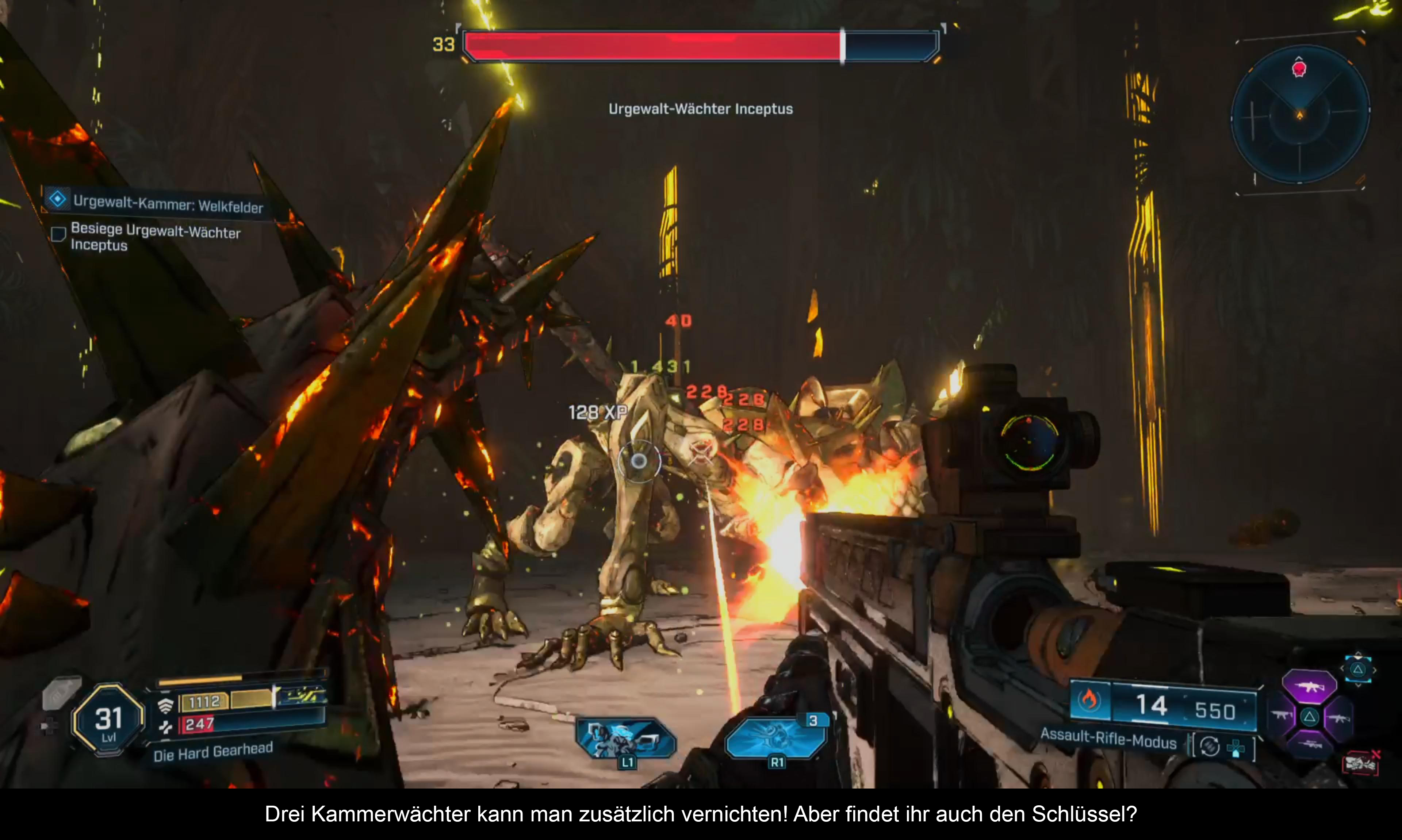 Allerdings schwankt die Qualität der Aufgaben zu sehr. Seltsame Klettereinlagen und lange „Bringe A nach B”-Quests stören den Rhythmus. Zumindest bieten die zahllosen Datalogs Einblick in die Welt und ihre Charaktere. Für das Finden der Kammerschlüsselfragmente gibt es als Belohnung ein Portal zu einem der drei mächtigen Kammermonster. Diese Welt wurde teilweise lieblos, teilweise aber auch gut überlegt mit jeder Menge Kleinkram vollgestopft und an jeder Ecke gibt es Gegner zu bekämpfen. Wie weit man diesen folgt, bleibt einem selbst überlassen. Wer aber spezielle legendäre Waffen haben will, muss diesen Aktivitäten nachgehen und hoffen, dass eines dieser Monster eine fallen lässt. Denn im Gegensatz zum Vorgänger gibt es keine einzigartigen Waffen als Belohnung mehr. Glücklicherweise lassen sich Missionen und Bosse aber immer und immer wiederholen. So habt ihr immer die Chance, dass ein Endgegner eine solche Waffe fallen lässt. Zudem bringen diese Missionen Anpassungen für euren Charakter, die jedoch nicht so einzigartig sind, wie man es sich wünschen würde.
