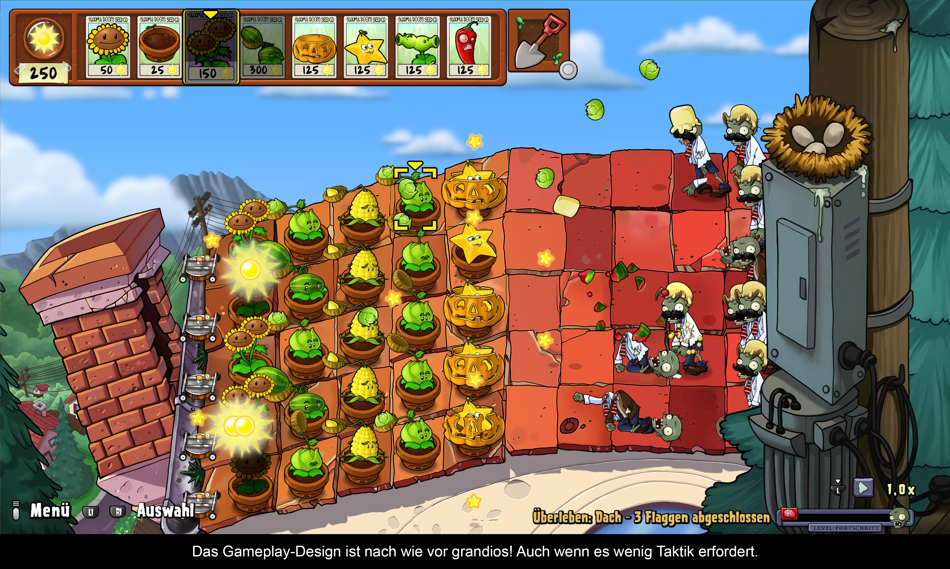 Auch wenn die eigentlichen Schöpfer der Spielserie nicht mehr bei PopCap Games arbeiten, hat das Team sein Bestes gegeben, um den Flair des ersten Teils einzufangen. „Plants vs. Zombies: Replanted” ist für Fans, Nostalgiker und Neulinge, die in die Serie einsteigen wollen, durchaus die definitive Version des Spiels. Das zeitlose Spieldesign ist auch nach 16 Jahren noch immer unterhaltsam und das Charakterdesign wirkt nach wie vor frisch. Auch beim Umfang wurde nicht gespart, sodass das Spiel jeden länger beschäftigen sollte. Eigentlich ist es das perfekte Spiel, wäre da nicht das veraltete Smartphone-Design. Zwar wurden alle Mikrotransaktionen entfernt und die Ökonomie dementsprechend angepasst, doch die Kernmechanik zum Grinden der Münzen bleibt bestehen. Hier hat man die Chance vertan, sich an moderne Konsolen weiter anzupassen. Auch bei der Anpassung der HD-Sprites sind kleinere Fehler passiert, die aber in der Hektik untergehen. Das Outro wurde ebenfalls nicht neu gestaltet und wirkt wie ein YouTube-Video aus dem Jahr 2009. Hinzu kommen kleinere Bugs, die das Triggern bestimmter Trophäen beeinflussen, sowie Animationen, die nicht sauber ablaufen. Der größte Kritikpunkt ist wohl, dass man dem Original zu sehr treu bleibt. In diesem Fall bin ich darüber allerdings sehr froh!