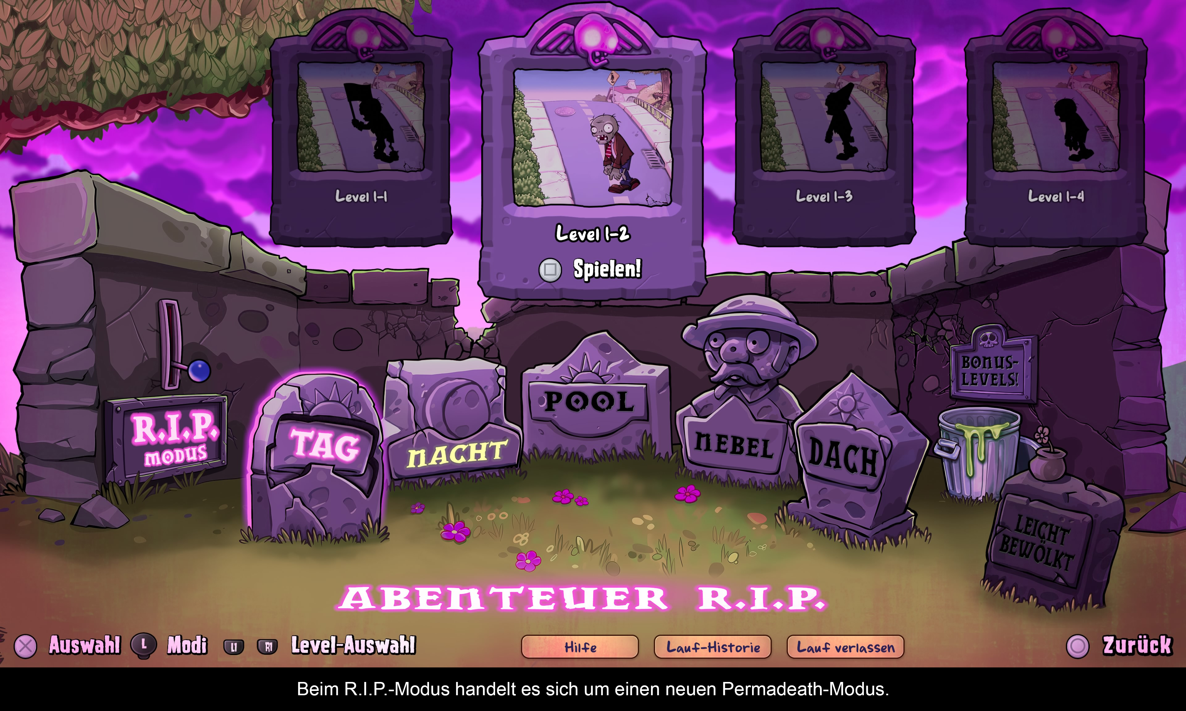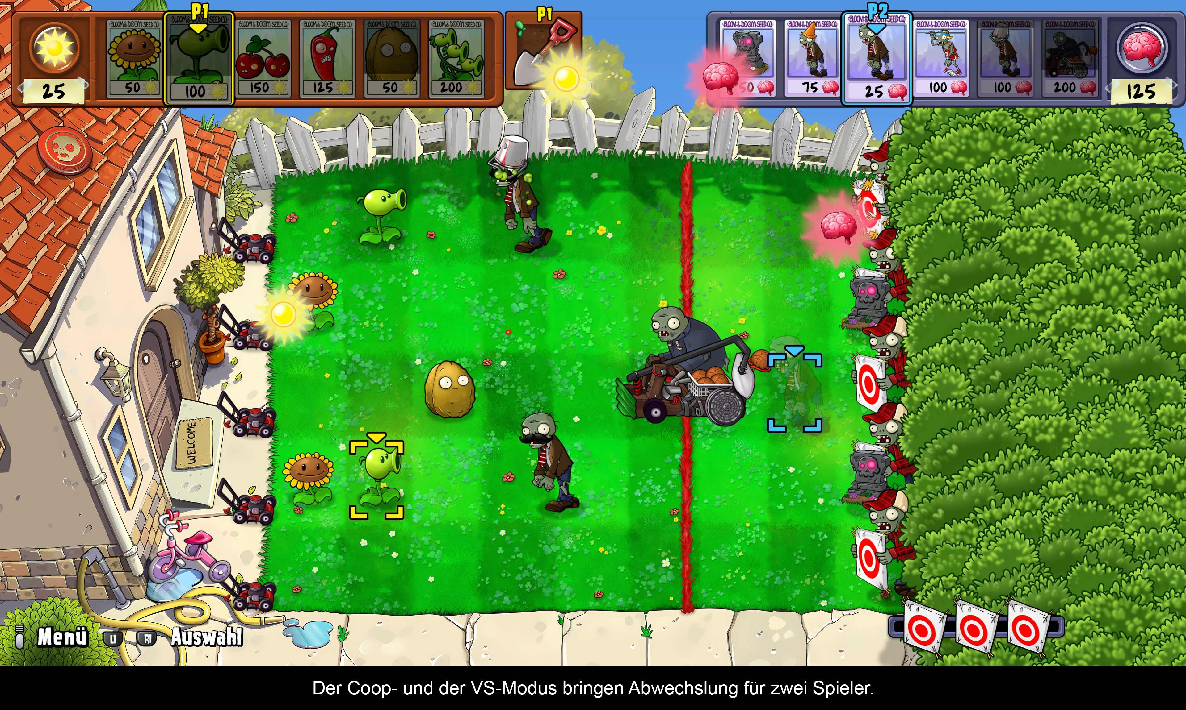 Leider hat man es im Zuge der optischen Generalüberholung verpasst, dieses Spiel mehr für Konsolen anzupassen. Noch immer blutet das Spiel den Grind der frühen 2010er F2P-Spiele. Wer sich in die zahlreichen Optionen stürzen möchte, muss sich zunächst im Abenteuer-Modus beweisen. Gut, dieser ist in ein paar Stunden erledigt und ersetzt das Tutorial, aber diese künstliche Blockade wäre nicht notwendig gewesen! Das Spiel bietet die volle Plants vs. Zombies-Erfahrung mit allen bisherigen Erweiterungen und neuen Überraschungen. Im Laufe des Abenteuers werden zuerst Minispiele, dann Rätsel und schließlich die neuen Spielmodi freigeschaltet. Erstmals gibt es einen Permadeath-Run für die Kampagne und der Bewölkt-Modus mischt Tag- und Nacht-Levels. Diese Spielmodi sind für Veteranen sehr interessant, da taktisches Vorgehen gefragt ist. Dazu erhält man jedoch erst am Ende der Kampagne Zugang. Auch alte Entwickler-Levels und ein unterhaltsamer Endlos-Modus haben es ins Spiel geschafft. Was den Umfang betrifft, haben die Entwickler alles, was diese Serie ausmacht, reingepackt und verbessert. Um die teilweise zähen Runden zu überstehen, gibt es nun eine Taste, mit der sich das Geschehen um den Faktor 2,5 beschleunigen lässt. Auch eine kleine Kunstgalerie mit frühen Konzepten ist vorhanden. Das Highlight dürfte aber der Koop-Modus für zwei Spieler sein, den man auch während des Abenteuers starten kann, ebenso wie den Versus-Modus. Hier übernimmt der Mitspieler die Rolle der Zombies.