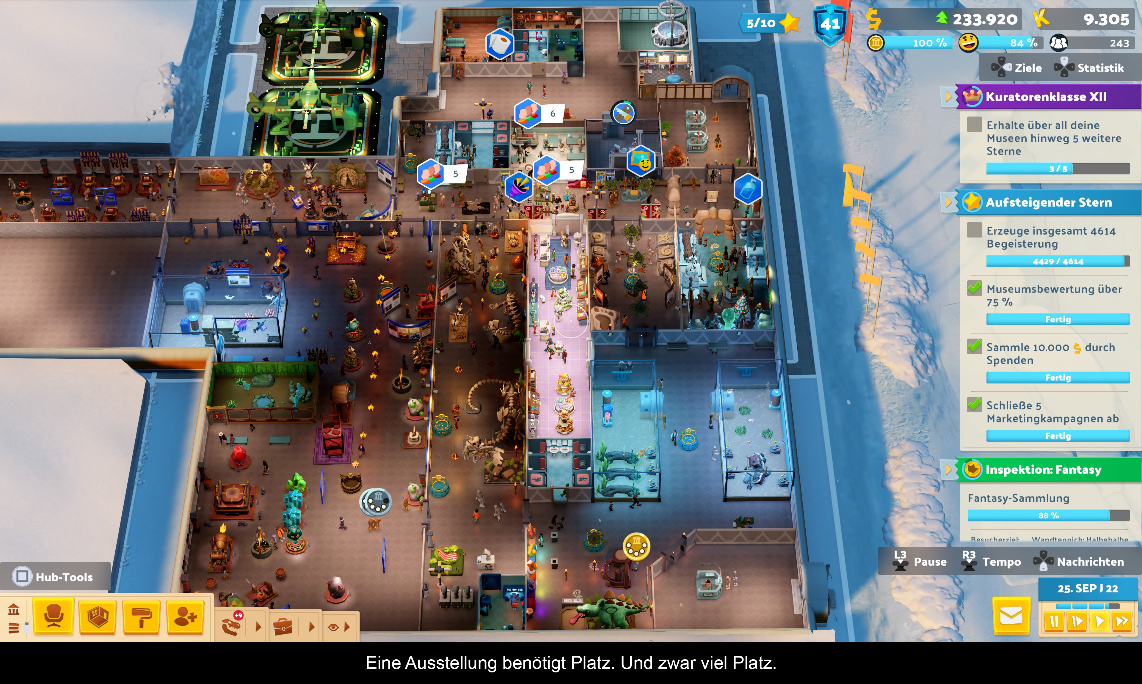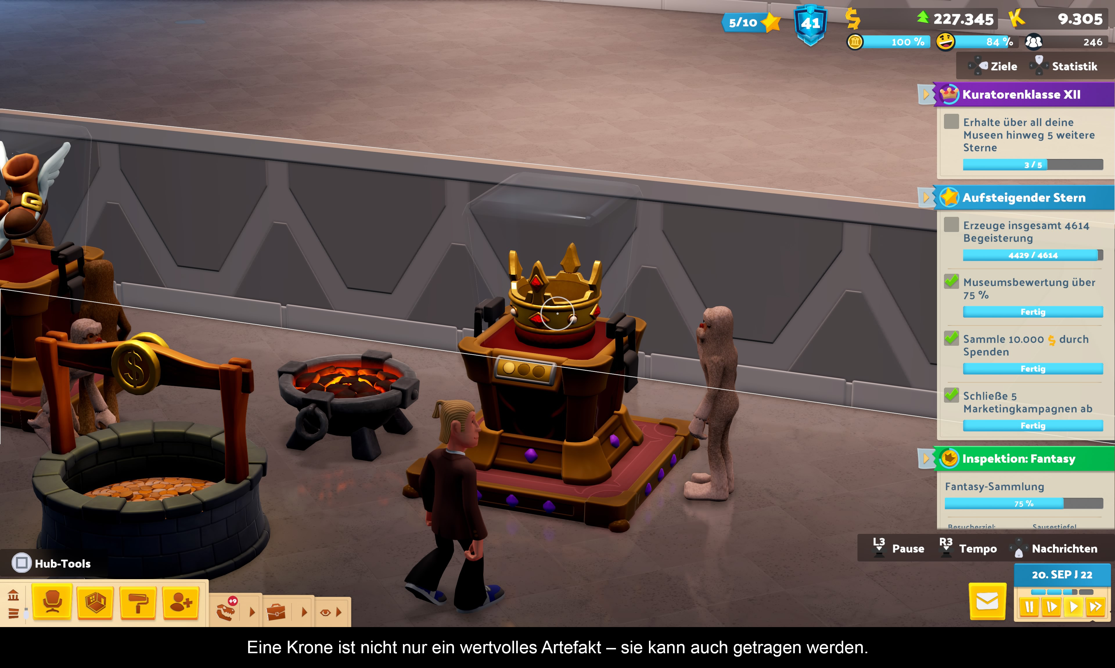 Dementsprechend bietet er mehr Umfang für die Gestaltung der einzelnen Museumsbereiche sowie neue interaktive Ausstellungsstücke. Mit den Zwergengeräten kehrt auch der Rätselaspekt zurück, den es schon bei den Anomalien gab. Mit dem großen Drachenskelett gibt es auch optisch etwas Wuchtiges und mit den vielen magischen Artefakten kann man schöne Ausstellungsräume gestalten. Als Bonus können Mitarbeiter angezogen werden, die dann weitere Vorteile erhalten und optisch angepasst werden können.