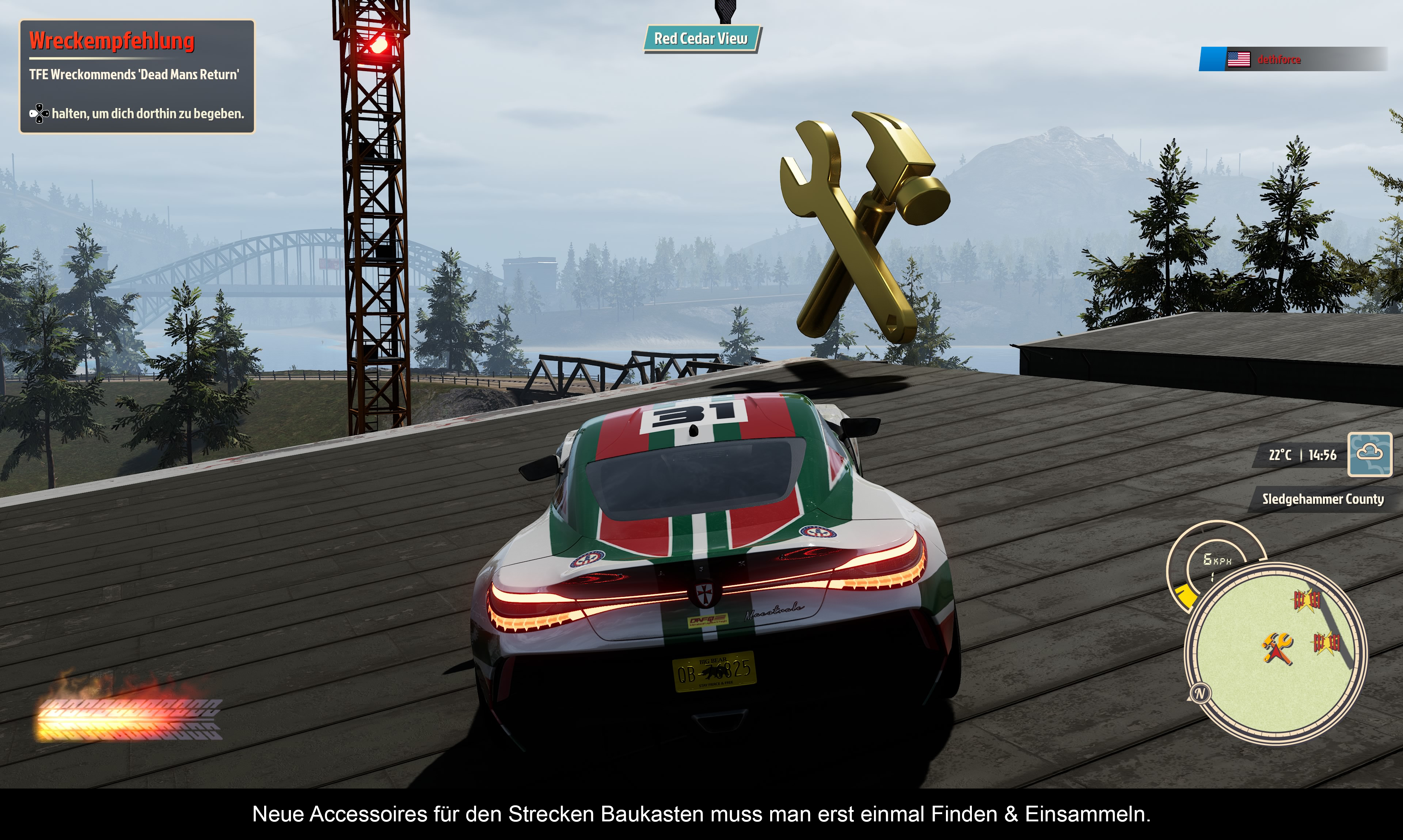 Natürlich kann man sich bei anderen Spielen inspirieren lassen. Aber man sollte niemals schamlos kopieren, denn der Grat zwischen Inspiration und schnödem Abklatsch ist äußerst schmal. "Wreckreation" bedient sich für meinen Geschmack etwas zu sehr am Design von "Burnout Paradise". Doch der Reihe nach: Der Entwickler Three Fields Entertainment wurde von ehemaligen Mitarbeitern von Criterion Games gegründet, darunter Alex Ward, einer der Köpfe hinter der ursprünglichen „Burnout“-Serie. Aber das ist auch schon eine Ewigkeit her und manche Designentscheidungen haben sich am Ende auch nicht als Gewinn entpuppt. So musste man die Spielwelt beispielsweise nicht für bildschirmfüllende Menüs verlassen, um Optionen zu ändern. Die Alternative dazu war jedoch ein winziges Messenger-Menü, welches über das Steuerkreuz bedient wird. Es gibt auch mehrstufige Burnout-Balken, Tore für Abkürzungen und Werbetafeln. Wie im Vorbild startet man Rennen, indem man die Tasten L2 und R2 gleichzeitig drückt. Auf jeder Straße kann man Rekorde erzielen, sei es durch den längsten Drift oder die schnellste Durchfahrt. In Echtzeit kann man sich dann mit Freunden messen und deren Rekorde überbieten. Wenn das Auto gewechselt werden soll, wird auf einen Schrottplatz gefahren… ach nee, hier ist es ein Parkplatz und die Karre wird gewechselt. Das war schon in „Burnout Paradise” umständlich und ist es heute umso mehr. Zudem existiert von jedem Fahrzeug eine getunte Version, für die man jedoch eine spezifische Herausforderung bestehen muss. Ist das Fahrzeug beschädigt, fährt man zur nächsten Tankstelle und lässt es von magischer Hand reparieren. Crashs gehören natürlich auch zum Tagesgeschäft. Der Aftertouch wurde dabei 1:1 aus der Vorlage übernommen. Mit diesem Manöver lässt sich das Wrack noch ein wenig bewegen, um auch die Gegner in einen Unfall zu verwickeln.