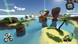 Genauso viel Überlegung wie in die Hintergrundgeschichte ist anscheinend auch ins Gameplay geflossen. Mit dem hubschrauberähnlichen Gefährt starten wir auf einer Insel und müssen nun Passagiere möglichst schnell von A nach B fliegen, durch Ringe fliegen oder allerlei Zeug transportieren – alles auf Zeit versteht sich. Das Leveldesign der sechs Inseln, die insgesamt in zwanzig Einzelabschnitte unterteilt sind, ist schlicht, unspektakulär und langweilig. Ein paar wenige Hindernisse stellen sich uns in den Weg, die aber kaum der Rede wert sind, denn das größte Hindernis ist unser fliegender Untersatz. Wem die Helikopter-Steuerung bei Grand Theft Auto IV zu fummelig war, den erwartet bei Landit Bandit die Hölle. Auch die nach und nach verfügbaren Power Ups wie Turbo oder Bungeeseil ändern daran nichts. Zusammen mit den immer gleichen Aufträgen, die teilweise unnötig in die Länge gezogen werden ergibt das ein Spiel, das man nach dem zweiten Level gleich wieder löschen will. Bleibt noch lokaler Multiplayer-Modus. Hier beharken sich zwei Spieler mit ihren Helis in einem simplen Deathmatch oder spielen die Story im Coop. Auch hier macht die Steuerung jeglichen Restspaß zunichte. Doch nicht alles ist schlecht. Obwohl die peinlichen Versuche, witzig zu sein, alle nach hinten losgehen, gibt es ein oder zwei nette und sogar lustige Ideen. Zum einen ist da das Ski-Springen gegen den Don der Pinguin-Mafia (ich erwähnte, dass die Story nichts taugt, oder?), der begrenzt für Spaß sorgt. Zum anderen begegnet uns ein Drache mit 3D-Brille, die wir ihm wegnehmen, was dazu führt, dass wir den folgenden Level als 2D-Scroller absolvieren müssen. Aber das war’s auch schon.