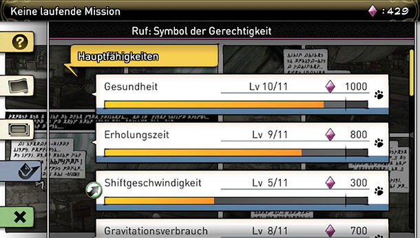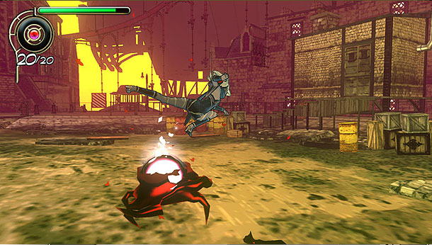 Die ersten Trailer ließen vermuten das es sich bei Gravity Rush um einen Open-World Spiel handelt, auch die Kräfte der schönen Kat lassen das vermuten. Das trifft nur bedingt zu. Zwar ist Hekseville offen begehbar, doch werden die Stadtteile deutlich von einander getrennt und erinnern mehr an einen großen Levelabschnitt. Wer auf einen anderen Kartenabschnitt will, kann mit Hilfe eines Schnellreise-System reisen oder man verlässt sich auf die örtlichen Transporteinrichtungen wie Zug oder Lufttaxi. Daneben gibt es noch viele Abschnitte in denen man einen klar definierten Weg folgen muss. Doch genug von der Welt, wie der Name vermuten lässt ist das wichtigste Spielelement die Macht der Gravitation. Mit einen Druck auf die Schultertasten hebt Kat vom Boden ab und man kann quer durch die Stadt gleiten. Wohin Kat fliegen soll entscheidet man mit Hilfe der Bewegungssensoren oder dem rechten Stick. Ist das Ziel gefunden, reicht ein Druck auf die X-Taste und man fliegt durch das Level. Dank der Gravitation ist es auch egal ob man senkrecht Gebäude hochläuft oder Plattformen von unten erkundet, wichtig ist nur das man genügend Gravitations-Energie hat. Wie bei einem Rollenspiel lässt sich diese und viele andere Werte verbessern. Alles was man dafür tun muss ist in der Stadt die unzähligen Kristallen einzusammeln und verschiedene Maschinen reparieren. Neben der Gravitationsenergie kann man in diesem Menü auch Kats Angriffe aufwerten, denn nur gleiten und Kristalle sammeln wäre auf Dauer doch zu eintönig.