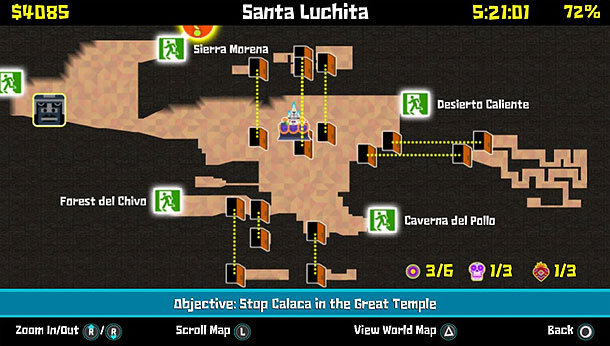 Wie bereits verraten, seid ihr ein Luchador und müsst euch im besten 2D-Stil durch vielzählige Welten kämpfen. Dabei stehen euch ein paar kleinere Combos zur Verfügung und im Laufe der Zeit erhaltet ihr dank einer alten Ziege einige weitere Tricks, die euch im Kampf etwas Abwechslung besorgen. Aber dadurch zieht auch der Schwierigkeitsgrad ziemlich an. Denn während am Anfang die Gegner mehr oder weniger hirnloses Kanonenfutter sind, kommen später Gegner ins Spiel, die von euch verlangen, dass ihr die neu erlernten Angriffe im Kampf auch verwendet, wenn man weiterkommen möchte. Denn manche Gegner verfügen über Schilde, die sich nur mit Angriff XY brechen lassen und andere greifen aus dem Boden an, wenn man sie nicht mit einem Angriff herausschlägt. Jedoch besteht das Spiel nicht nur aus Kämpfen, sondern fast noch aus mehr Geschicklichkeit. Denn oftmals müsst ihr die erlernten Angriffe und Moves in halsbrecherischen Aktionen kombinieren, um neue Areale des Spiels zu erreichen. Dabei wird aber auch etwas Gehirnschmalz benötigt, da die Lösung nicht immer offensichtlich ist. Trotzdem bleibt das Spiel immer fair, denn obwohl das Spiel immer schwieriger wird, werden auch die eigenen Fähigkeiten in der Steuerung immer besser und so wird man immer genau richtig gefordert. Besonders die Endgegner seien hier zu erwähnen, die einen wirklich auf die Probe stellen und teilweise auch für Frust sorgen können. Sobald man aber deren Angriffspaletten gelernt hat, sind auch diese kein großes Problem mehr.