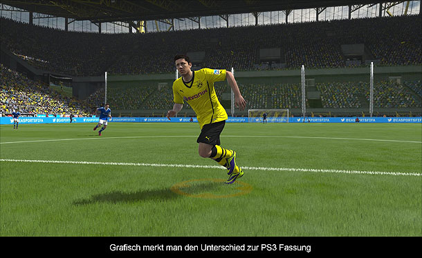 Das erste was einem bei einer neuen Konsolengeneration ins Auge fällt, ist natürlich die Grafik und hier gibt es in FIFA 14 einen sichtbaren Unterschied. Selbst im laufenden Spiel sieht man die vielen neuen Details und kann Spieler deutlich besser unterscheiden. In Nahaufnahmen kommen dann noch mehr Details hinzu und einige Spieler sehen dann ihren Vorbildern wirklich ähnlich und andere (Kuba von Dortmund z.B.) gar nicht. Zudem hat der Rasen nun wirklich Grashalme und bei Schüssen etc. sieht man sogar das aufgewirbelte Gras. Die wirklichen Stars der neuen Grafikengine sind jedoch einerseits die neuen Animationen und andererseits das Stadion mit den Fans. Es sieht einfach unglaublich atemberaubend aus, wenn beispielsweise 80.000 Gelb-schwarze 3D-Fans Fahnen hochhalten, jubeln und singen. Aber nicht nur die sind ausmodelliert, sondern sogar die Auswechselbank ist mit den echten 3D-Modellen bestückt und sorgt somit für wirkliches TV-Feeling. Hinzu kommt, dass EA nochmals daran gearbeitet hat, dass der Spielfluss besser wird, wodurch Einwürfe immer schnell ausgeführt werden, da nun ein virtueller Balljunge immer einen Ball parat hat, falls der eigentliche Ball in die Tribüne geht. Und das ist nur ein Beispiel von vielen.