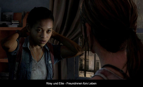 Die Geschichte in Left Behind stellt ein Prequel zu „The Last of Us“ dar und erzählt die Geschichte von Ellie und ihrer Freundin Riley. Letztere taucht plötzlich wieder bei Ellie auf und überredet diese mit ihr aus dem Camp auszubüchsen, um eine Nacht lang die Freiheit zu genießen. Dabei dürften Spieler des Hauptspiels bereits wissen, wie die Geschichte endet, aber es lohnt sich trotzdem. Denn Naughty Dog lenkt die Sichtweise in Left Behind auf die schwere Kindheit der Jugendlichen in einer Welt voller Gefahren und keinem Spaß, da die Aussicht hoffnungslos ist. So gibt es zahlreiche Szenen in denen verdeutlicht wird, wie die kleinen Dinge des Lebens die Welt schon etwas fröhlicher erscheinen lassen und das auch in so einer Welt Kinder durch alle Lebensphasen gehen müssen.