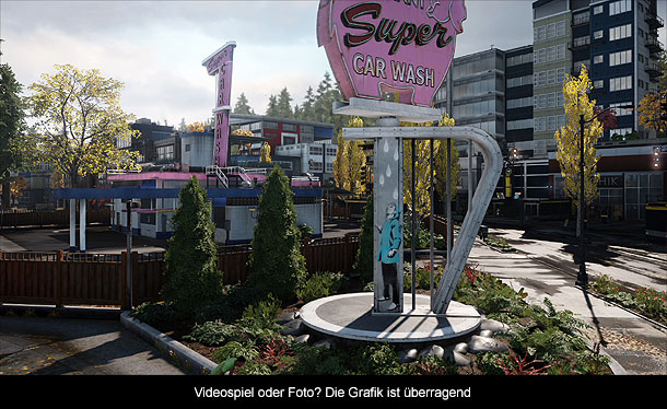 „inFAMOUS: Second Son“ ist ein Open World Spiel und diese sehen von Natur aus meist etwas schlechter aus als das was man sonst auf einer Konsole zu sehen bekommt, weil natürlich viel mehr los ist in einer riesigen Stadt als in einem Schlauchlevel eines Shooters. Daher ist es umso höher anzurechnen, was Sucker Punch mit „inFAMOUS: Second Son“ abgeliefert hat. Denn das Spiel ist auf der PlayStation 4 das definitiv schönste Spiel und läuft zudem in 1080p bei 30 Bildern pro Sekunde, die man nahezu auch jederzeit halten kann. Nur ganz selten bricht die Bildrate mal etwas ein und selbst dann ist man vor nervigen Effekten, wie Tearing oder Aliasing geschützt. Dabei erhält man nicht nur astrein modellierte Charaktere mit allerlei Details, sondern auch eine große und lebhafte Welt, die zu jederzeit perfekt in Szene gesetzt wird. Dies ist vor allem der genialen Beleuchtung mit den dynamischen Schatten zu verdanken. Vor allem nachts kommt man aus dem Staunen nicht mehr heraus, wenn Neonlichter leuchten, Fahrzeuge ihr Scheinwerferlicht werfen und dabei der Regen für tolle Spiegelungen sorgt. Einzig der Schatten Delsins ist etwas komisch, denn nicht immer ist einer zu sehen. Die Entwickler erklären dies damit, dass dies nachts ausgeschaltet wird, weil bei so vielen Lichtquellen der Schatten eh nicht zu sehen wäre und es somit nur unnötig Rechenleistung verbrauchen würde. Die meiste Zeit geht die Rechnung auch auf, aber manchmal gibt es doch ein Licht und man sieht dann keinen Schatten, was etwas komisch aussieht. Kein großartiges Problem, aber eben doch ein einziger Kritikpunkt in Sachen Grafik. Denn ansonsten erhält man mit der Beleuchtung und den Partikeleffekten der Kräfte einfach etwas geboten, was man so noch nicht gesehen hat. Dagegen können sogar Spiele, wie „Killzone: Shadow Fall“ einpacken. Übrigens hat Sucker Punch sich für die Stadt die amerikanische Großstadt Seattle als Vorbild genommen. Zwar gibt es kein detailgetreues Abbild der Stadt, aber die wichtigsten und markantesten Punkte gibt es auch im Spiel, wie die weltbekannte Space Needle. Ortskundige dürften noch viel mehr Orte finden.