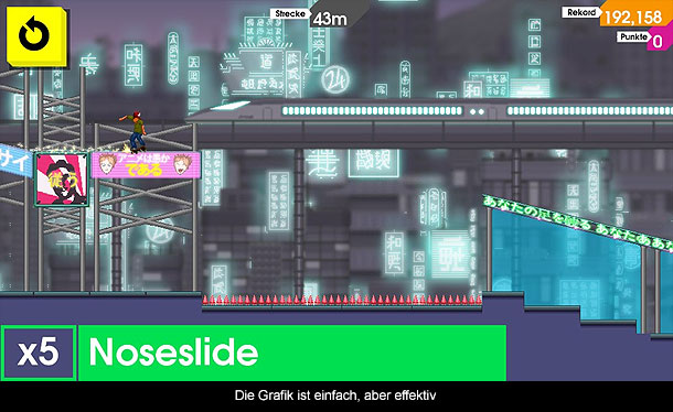 „OlliOlli“ zeigt einem ziemlich schnell, wo die Grenzen liegen und zählt zu dieser Art von Spiel, wo Freud und Leid extrem dicht zusammen liegen. Das Timing muss fast Pixelgenau sein, da man sonst an den Plattformen vorbei fliegt, oder eine unsaubere Landung hinlegt. Leider macht es die Steuerung von „OlliOlli“ den Spieler etwas schwer, in hohe Punkteregionen vorzudringen. Dies ist nämlich etwas überladen. Die über 100 Tricks startet man alle über den Analogstick und merkt recht schnell, dass hier nur Nuancen zwischen den Stickbewegungen liegen. Da das Spiel ziemlich schnell ist und man stets das richtige Timing benötigt, fällt es dem Spieler sehr schwer, den gewollten Trick auszuführen. Hinzu kommt noch der L/R Button, welcher die Spielfigur rotieren lässt. Landen tut man übrigens mit X, während man einen Grind mit einem Druck in eine gewünschte Richtung auf den Analogstick startet. Auch hierbei muss das Timing stimmen, da bei einer schlechten Landung schnell viele Punkte flöten gehen, oder der namenlose Skater ins Schwanken kommt.