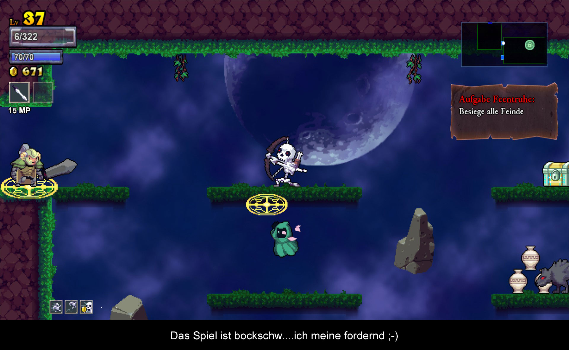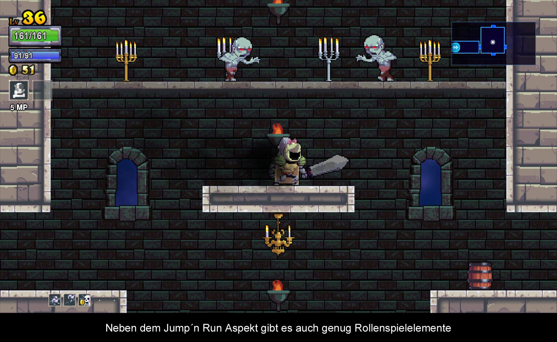 Ein weiteres Rollenspiel-Element sind die einzelnen Händler, die man vor dem Betreten des Schlosses besuchen kann. Wer das nötige Kleingeld parat hat, kann sich dort nicht nur Rüstungen, sondern auch neue Fähigkeiten besorgen. Was die Grafik angeht setzt „Rogue Legacy" auf Retro Charme pur. 2D Sprites, die an klassische SNES Zeiten erinnern sorgen für reichlich Nostalgie. Selbstverständlich ist das Spiel keine grafische Referenz, aber die weitläufigen Areale, geringe Ladezeiten, sowie die zahlreichen Gegner wären in dieser Form mit Sicherheit nicht auf einer 16Bit Konsole möglich gewesen. Ebenso lobenswert ist die akustische Seite des Spiels. Simple Chip-Tunes erinnern, wie auch die Optik, an die guten alten 90er.