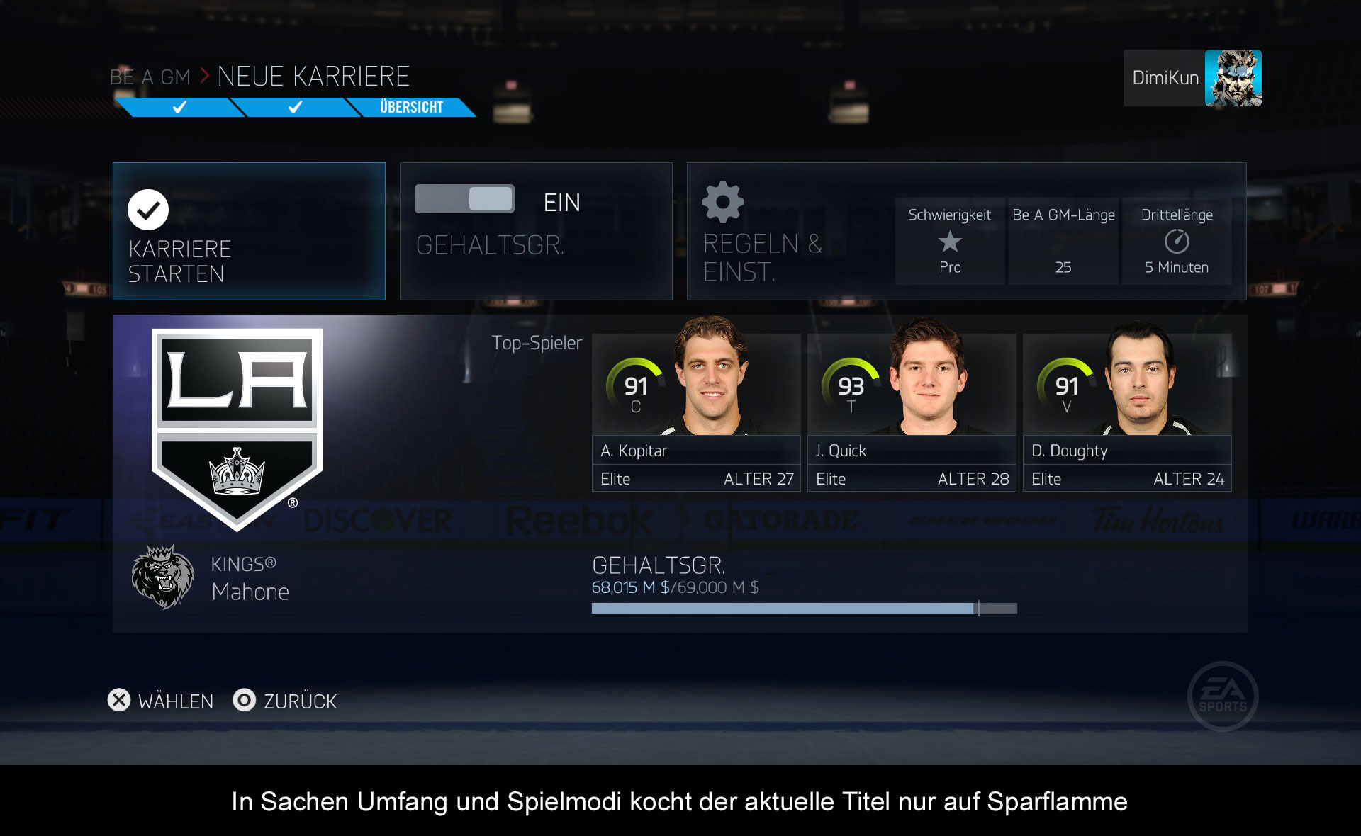 Ähnlich sieht das Geschehen auch beim Be A GM Modus aus, wo man auf der PS4 leider nur ein Team der NHL leiten kann. Dies ist natürlich umso bedauerlicher, wenn man bedenkt, dass das Spiel auch die offizielle DEL Lizenz besitzt. Ähnlich, wie beim Be A Pro Mode ist der Handlungsbereich relativ eingeschränkt, was man unter anderem am automatisierten Draft-Prozess sieht. Das Einzige was man noch beeinflussen kann ist die Kader- und Managementplanung. Und auch der Ultimate Tam Modus kommt nicht ohne Cuts aus. So gibt es beispielsweise weder Turniere noch die Möglichkeit gegen seine Freunde zu spielen. Stattdessen gibt es nur begrenzt spannende 1 vs 1 Duelle, die man entweder online oder offline bestreiten kann. Wer sich damit jedoch abfinden kann bekommt einen mächtigen Modus, wo man ganz nach eigenem Belieben sein eigenes Team zusammenstellen kann. Es wäre jedoch wünschenswert gewesen, wenn es noch mehr Herausforderungen für die eigene Mannschaft geben würde. Und so besteht auch trotz zahlreicher Kaderentwurfsmöglichkeiten die Gefahr, dass die Luft aus dem Modus ganz schnell wieder raus ist.Die große Anzahl an gekürzten Modi und Features ist nicht nur schockierend, sondern auch enttäuschend. Insbesondere wenn man bedenkt, dass das Spiel nach wie vor zum Vollpreis angeboten wird. Es bleibt zu hinterfragen, was der Grund für das Fehlen besagter Features ist. Zeit? Geld? Ich kann es euch leider nicht sagen. Bislang weiß man nur, dass einige Features via Patches hinzugefügt werden soll. Und weitere werden wohl nächstes Jahr in Form eines „neuen“ Spiels präsentiert.