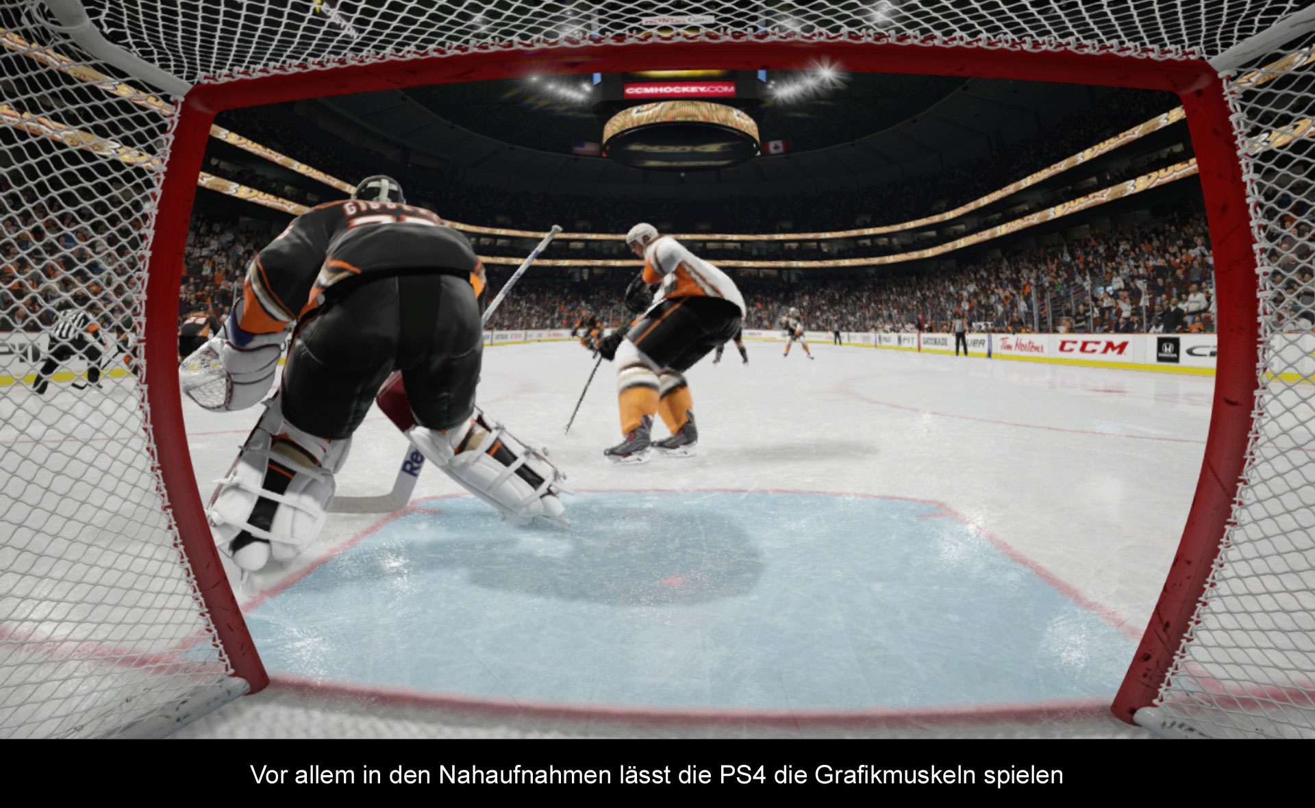 Willkommen in der nächsten Generation, NHL! Nach langer Wartezeit dürfen sich Eishockey Fans nun endlich über eine neue Grafik-Engine freuen, die der angestaubten PS3 Optik ein wenig auf die Sprünge helfen soll. Dies sieht man insbesondere bei den ungemein detaillierten Charakter- und Kleidungsmodellen. Hinzu kommen knisternde Arenen und halbwegs zufriedenstellende Publikumsmodelle. In Kombination mit der offiziellen NBC Lizenz gelingt es EA echtes TV-Feeling auf die Mattscheibe zu zaubern. Und wer seine Freunde mal auf die Probe stellen will, sollte als Hauptkamera die „Real Broadcast“ Perspektive auswählen. Hier wirkt das Geschehen sogar nochmal ein Stück realistischer – fast schon TV-like. Aber wie schon erwähnt wird die Optik in regelmäßigen Abständen durch ein paar hakelige Animationen gestört. Und auch die hübschen Klamotten bewegen sich ab und zu etwas zu unrealistisch. Außerdem sind die Ladezeiten einen Tick zu lang geraten. Was die akustische Seite angeht stehen natürlich vor allem die beiden Kommentatoren Mike Emrick und Eddie Olczyk im Vordergrund. Trotz der guten Reputation, die die Beiden in den Vereinigten Staaten genießen, muss man leider zugeben, dass die virtuelle Darbietung der Beiden auf der Konsole etwas hölzern wirkt. Statt interessanter Dialoge gibt es meist nur simple Beschreibungen und anspruchslose One-Liner. Immerhin überzeugt wenigstens die Stadionatmosphäre durch lautstarke Zuschauer und krachender Rockmusik.