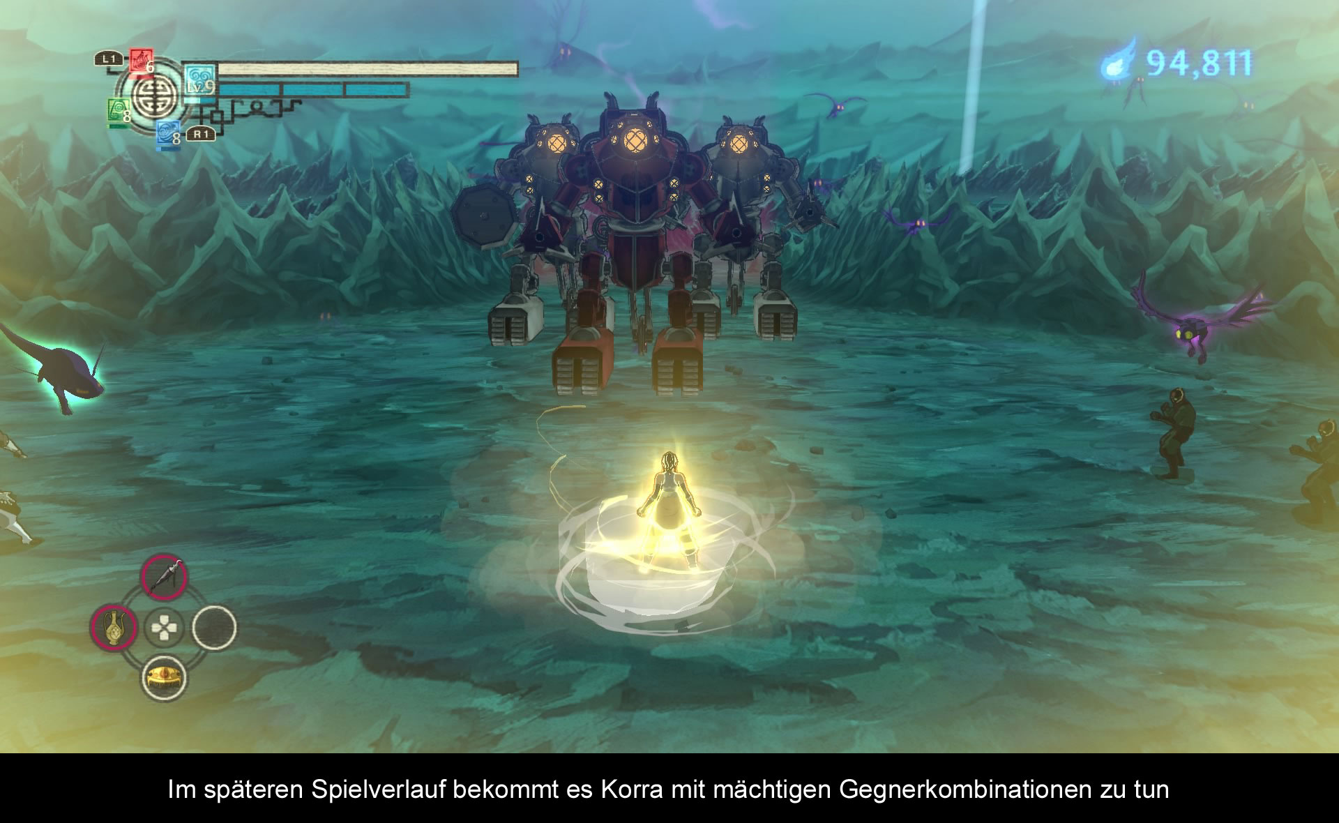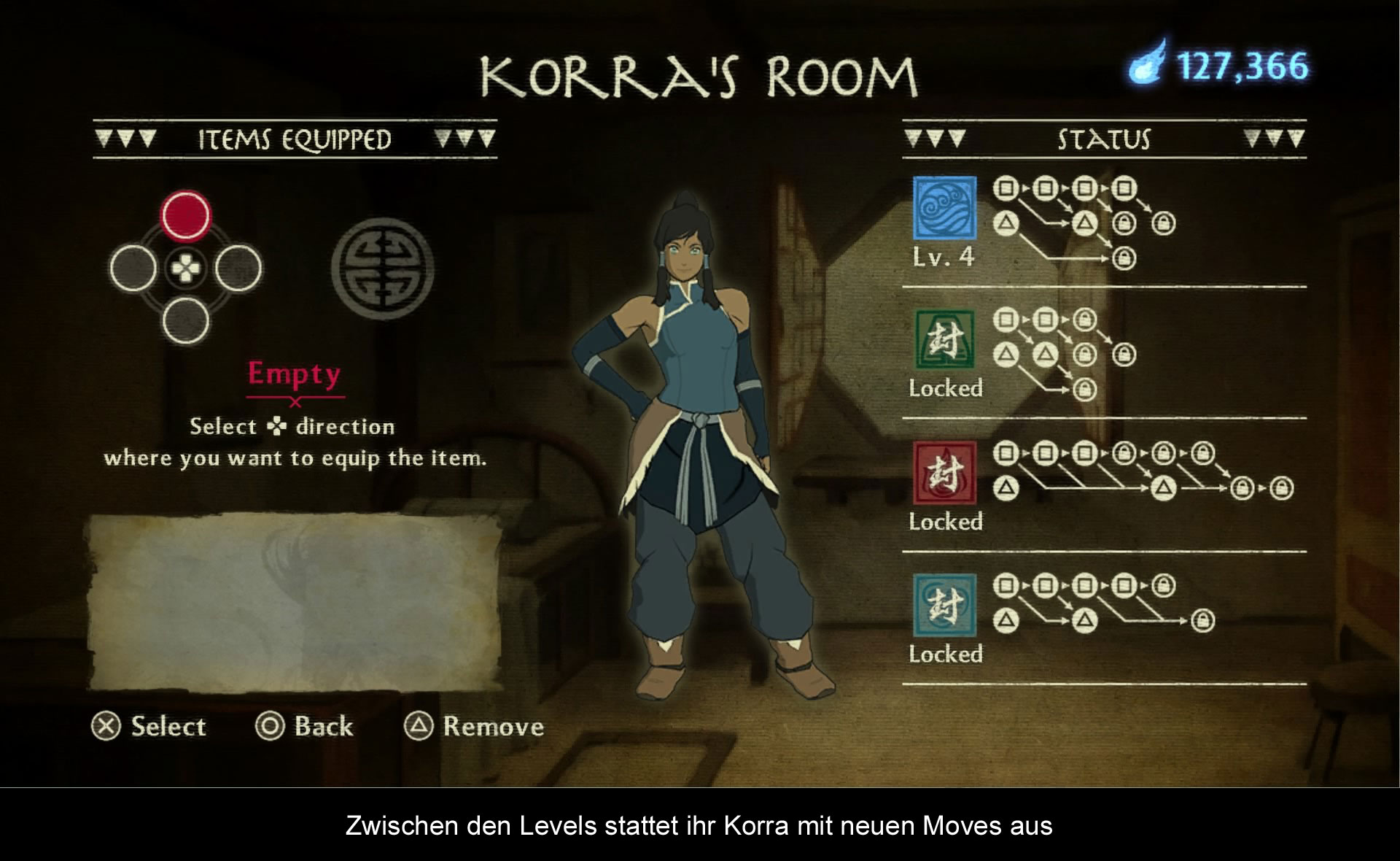 Kein grundlegender Negativpunkt ist wohl der Schwierigkeitsgrad. Für die angepeilte Zielgruppe scheint dieser sehr hoch. Rücksetzpunkte sind zudem nicht gut gesetzt und die hektische Kamera und Steuerung tragen schon mal bei, dass man bei den vielen Sprungeinlagen in die Tiefe stürzt. Zumindest für die Kämpfe kann man sich in einem Geschäft mit Heiltränken, neuen Attacken und Talismane vorbereiten. Dazu levelt man Korras Fähigkeiten immer weiter auf und am Ende gewinnt man langsam die Oberhand. Sobald alle Fähigkeiten maximiert sind, hat man ein beeindruckendes Repertoire an Kombos und Angriffen. Die erworbenen Fähigkeiten kann man im Extreme Modus auch brauchen, denn dieser ist eine wahre Herausforderung. Leider gibt es bis auf die Gewissheit, dass man das System beherrscht, keine Bestenliste für Speed Runs. Da hätte man mit wenig Aufwand mehr herausholen können. Um ein rundes Gesamtpaket zu gestalten, hat man zusätzlich noch eine Pro-Bändigung Modus eingebaut. In diesem Spieltyp kämpfen zwei 3-Mann Teams bestehend aus einem Wasserbändiger, Feuerbändiger und Erdbändiger auf einen Spielfeld gegeneinander. Eine nette Dreingabe, welche jedoch sehr schnell langweilig wird.