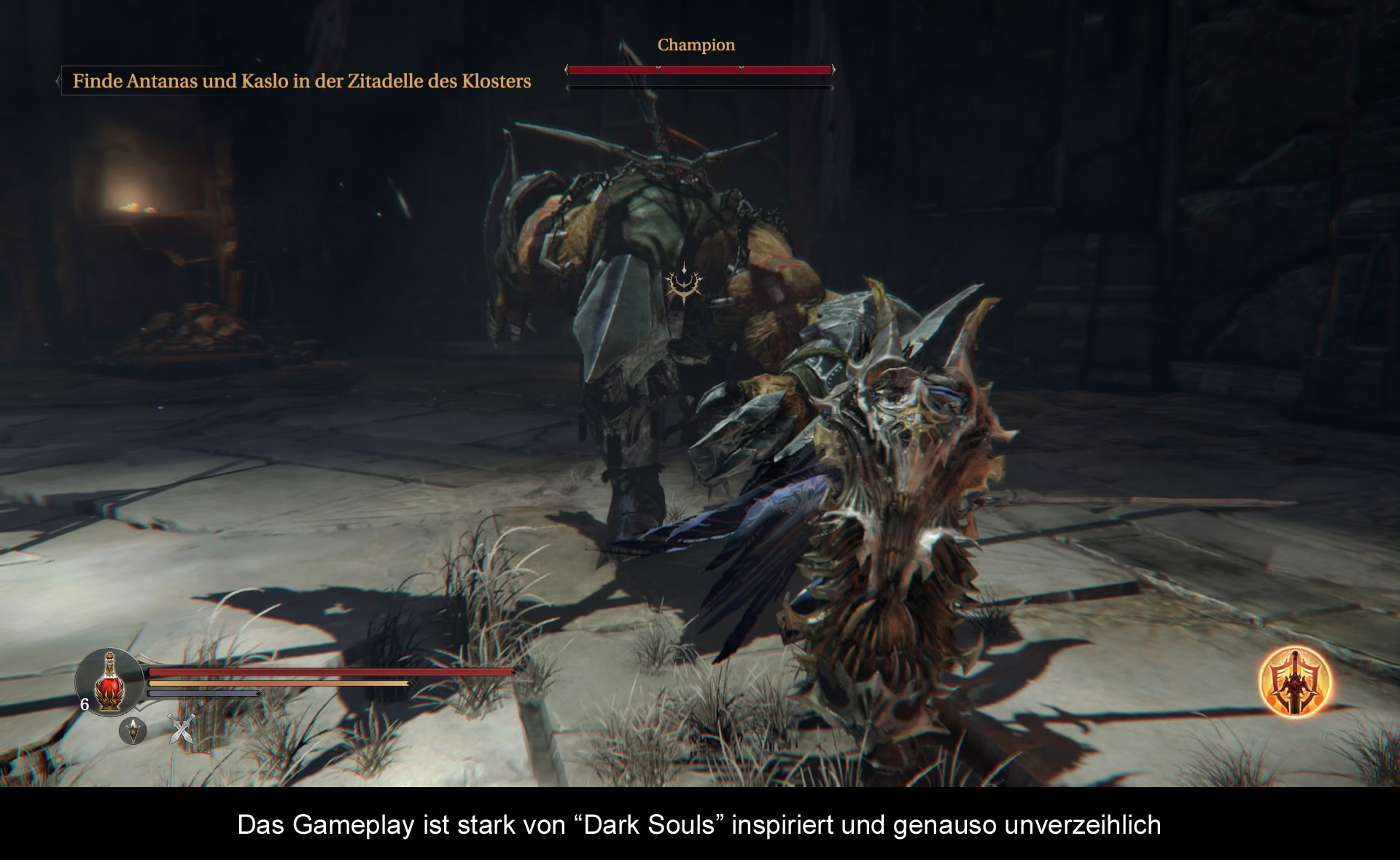 Gameplaymäßig orientiert sich das Spiel offensichtlich an der „Demons“ bzw. „Dark Souls“ Reihe. So hat man zu Beginn des Spiels die Wahl zwischen drei Klassen, die sich in ihren Werten wie Stärke, Agilität & Co. leicht unterscheiden und dementsprechend auch anders spielen. Bei allen Klassen gilt das, aber Vorsicht ist besser als Nachsicht. Jeder Gegner ist eine ernstzunehmende Gefahr und man ist schneller tot, als einem lieb ist. Dabei gilt es in erster Linie den Angriffen der Gegner auszuweichen, um einen gefährlichen Konter setzen zu können. Wer blind drauflosrennt, wird selten Erfolg haben, da sich viele Gegner gekonnt verteidigen können. Die Kunst ist es daher die Angriffe der Gegner auswendig zu lernen und die richtigen Momente zum Angriff abzuwarten. Wichtig ist es auch die Gegner voneinander zu isolieren, da mehrere Gegner gleichzeitig meist das Ende für einen selber bedeuten. Sollte es doch mal zum Bildschirmtod kommen, wird man an einen der spärlich gesetzten Checkpoints zurückversetzt und es beginnt ein Timer. Denn damit die bislang erlangten Erfahrungspunkte nicht komplett verloren gehen, bekommt man noch mal eine Chance und kann an dem Ort seines Todes zumindest einen Teil seiner Erfahrungspunkte zurückerlangen. Leider muss man sich auf dem Weg dahin nicht nur beeilen, sondern auch aufpassen, da alle Gegner wiederbelebt wurden. Wer dann ein weiteres Mal stirbt, verliert die Erfahrungspunkte. Leider ist die Kamera dabei nicht hilfreich und sorgt durch völlig abstruse Kameraeinstellungen gerne mal für einen schnellen Tod. Schafft man es doch mal bis zu einem der Checkpunkte, kann man da seine Lebenspunkte auffrischen und die gesammelten Erfahrungspunkte einlösen, um die Attribute des Charakters zu verbessern. Denn mit besseren Attributen lassen sich auch bessere Rüstungsteile anlegen, die wie in einem RPG üblich unterschiedliche Auswirkungen auf den Charakter haben. So erschweren z.B. schwere Rüstungsteile das Ausweichen per Rolle und eine schwere Axt braucht zwar länger zum Angreifen, macht dafür aber mehr Schaden als ein Dolch. So kann man sich trotz der recht strikten Klassenbeschränkungen dann doch einen Charakter nach eigenen Vorlieben zusammenstellen.