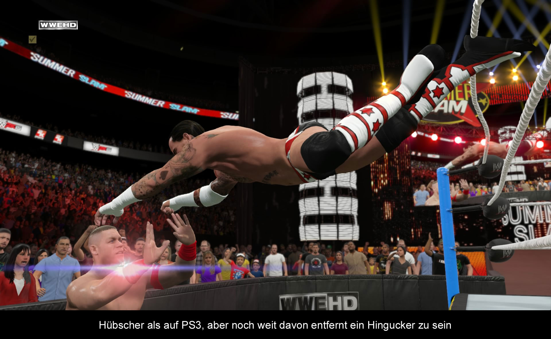 Etwas interessanter ist dagegen schon der 2K Showcase Modus. Hier geht es um die Rivalitäten der Wrestler untereinander. Davon gibt es zwei im Spiel. Einmal zwischen John Cena und CM Punk und „TODODODODO“. In beiden spielt man den Werdegang der Rivalität mit allen denkwürdigen Ereignissen nach und muss während der Kämpfe auch diverse Ziele erreichen, um den Verlauf der Geschichte nachzustellen. Beispielsweise muss man so in einem Kampf gegen John Cena diesen unbedingt durch einen Pinfall besiegen usw. Hier wird das Spielgeschehen dann auch durch die allseitsbekannten Unterbrechungen durch andere Kämpfer aufgelockert und es kommt dem echten WWE Geschehen am nächsten. Unterstützt wird die Geschichte auch noch durch Originalausschnitte aus den einzelnen WWE Sendungen, die schon fast Doku-Charakter haben. Leider gibt es nur die zwei Rivalitäten, die auch noch etwas kurz sind. Mehr gibt es nur gegen Geld, was einen etwas faden Beigeschmack hinterlässt. Da wirkte der „Road to Wrestlemania“ Modus im letzten Jahr deutlich umfangreicher und man hat wieder das Gefühl einen Rückschritt zu machen.