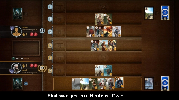 Gwint verdient einen eigenen Absatz, so gut ist das Spiel, das Geralt und seine Gefährten spielen. Gwint ist ein Kartenspiel in der Spielwelt, das von nahezu jedem Händler, Schmid oder sonstigen wichtigen NPC gespielt wird. Es hier zu erklären wäre zu Umfangreich. Es sei jedoch erwähnt, dass es leicht zu lernen und nicht zu schwer zu meistern ist. Die Karten, auf denen Geralt und seine Kollegen, Monster, wichtige Persönlichkeiten und normale Streitkräfte bzw. Monster abgebildet sind, können gesammelt und zu einem Deck zusammengestellt werden. Hier kann viel Zeit investiert werden, um eine gute Strategie zu entwickeln, mit welcher man nahezu jedem Gegner gewachsen ist. Die Karten lassen sich meist bei Wirten erwerben, im Spiel gegen andere NPC’s gewinnen, oder sind Belohnung für manch eine Quest. Online spielbar ist Gwint nicht. Generell gibt es bei The Witcher 3 keinen Online-Modus, was jedoch bei der riesigen, umfangreichen Spielwelt nicht weiter stört.