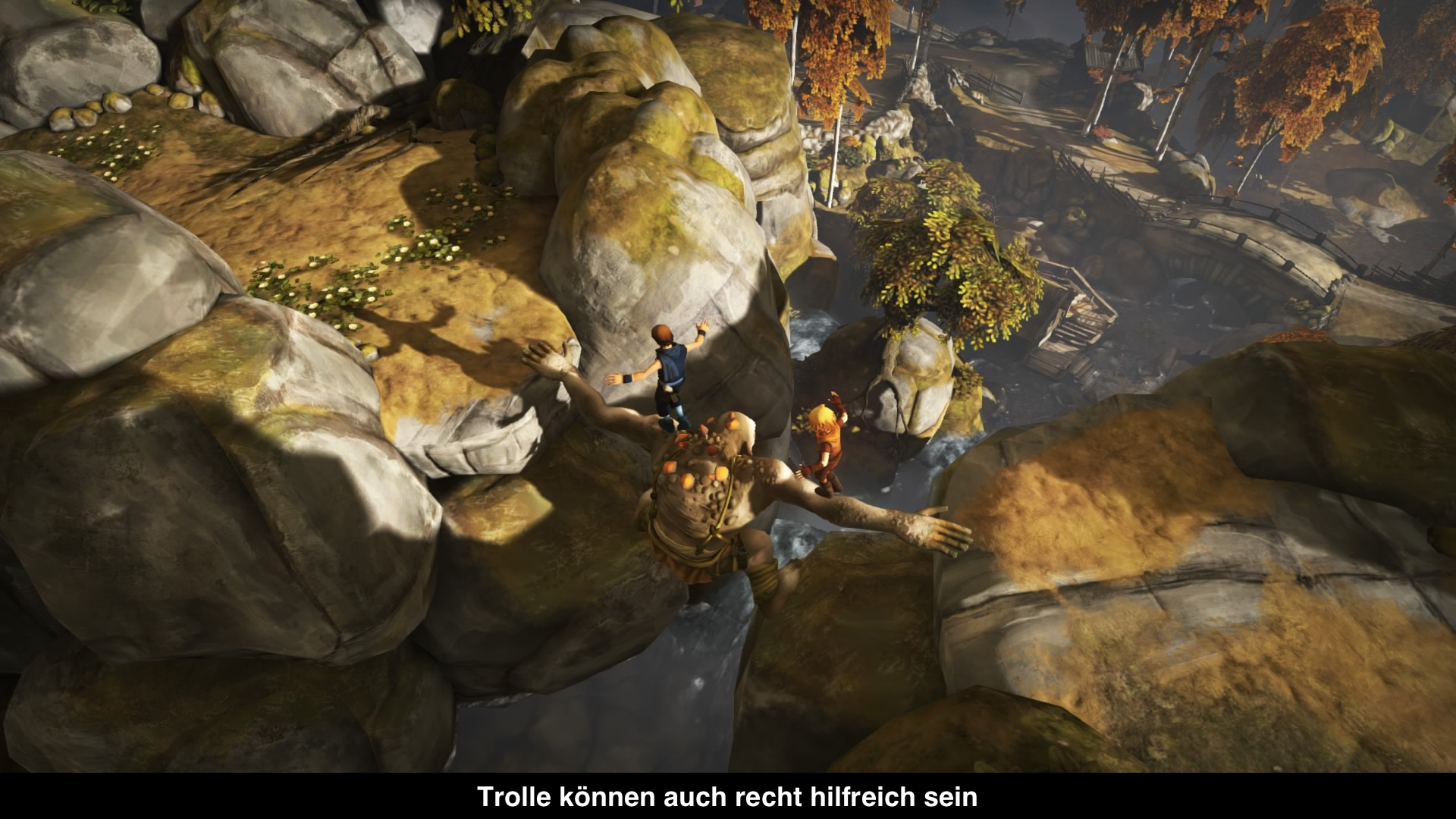 Spielerisch verfolgt Brothers: A Tale of Two Sons ein sehr interessantes Konzept, denn man steuert beide Brüder gleichzeitig. Pro Bruder nutzt man einen der Analogstocks und die passende L2- bzw. R2-Taste, um mit der Umwelt zu interagieren. Anfangs ist das Konzept noch sehr gewöhnungsbedürftig, aber mit der Zeit gewöhnt man sich doch daran. Wirklich intuitiv wird es aber nie, obwohl man ständig Rätsel und Aufgaben mit den beiden zu lösen hat. Mal muss man mit einem der Brüder einen Troll ablenken oder aber den Weg für den anderen frei machen. Wer möchte kann auch ganz viel mit der Umwelt interagieren und je nachdem mit welchem Bruder man es macht, ändert sich auch die Reaktion. Während der ältere Bruder meist seriös bleibt und Dorfbewohnern hilft oder sie nach dem Weg fragt, ist der jüngere Bruder für jeden Spaß zu haben. Leider benötigt keines der Rätsel wirklich etwas Grips, da die Lösung immer auf der Hand liegt und man so quasi kaum scheitern kann. Irgendwann wiederholen sich die Aufgaben auch immer mehr.