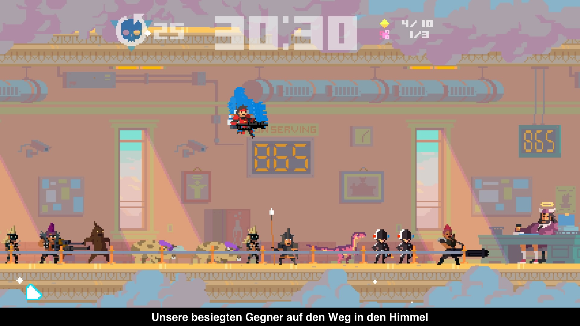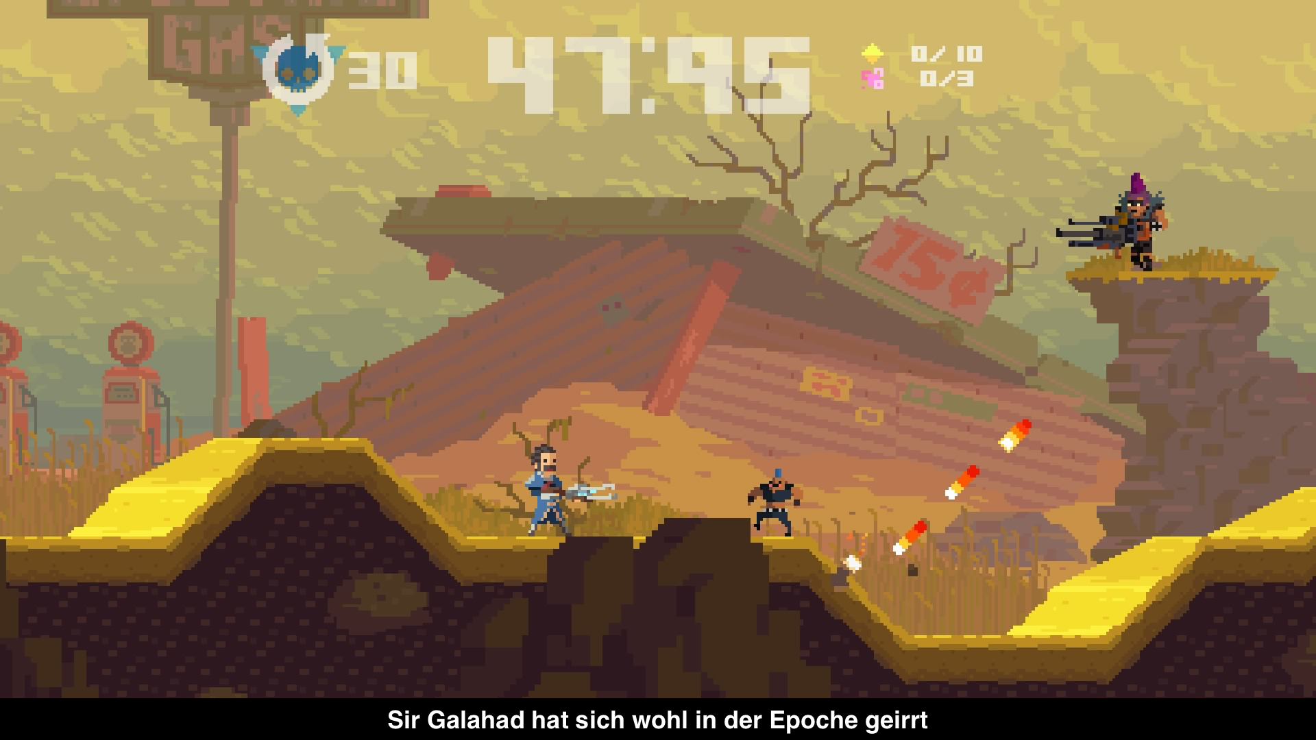 Was das Gameplay angeht, präsentiert sich Super Time Force Ultra als Action-Plattformer aus der Seitenansicht im Stile eines Metal Slug oder Contra. Dementsprechend fällt auch die Steuerung recht gleich aus und ist simpel gehalten. Ihr könnt springen und in acht Richtungen schießen. Die Besonderheit ist aber nun das Zeitreise-Feature. Denn pro Level habt ihr 60 Sekunden Zeit es abzuschließen, was erstmal nach wenig klingt. Doch pro Level hat man auch die Möglichkeit 30 Mal die Zeit zurückzudrehen und die Szenen nochmals zu erleben. Dabei bleibt das „alte Ich“ aber bestehen. Wenn ihr z.B. mit dem alten Ich einen Gegner besiegt habt, könnt ihr zurückreisen und euch das Geschehen in Ruhe aus der Ferne ansehen. Das klingt recht einfach, ist aber gar nicht so leicht, da das ganze gerne mal im Chaos endet, wenn fünf oder mehr Charaktere über den Bildschirm laufen und alle ihre Waffen abfeuern, wird es unheimlich unübersichtlich. Zudem gibt es Stellen, die etwas unglücklich laufen und man findet sich dann quasi in einer Endlosschleife wieder und muss die Zeit weiter zurückdrehen, um nicht ständig von den Schüssen der Gegner erledigt zu werden. Während man die Zeit zurückdreht, kann man auch seinen Charakter wechseln. Denn die Super Time Force besteht natürlich aus mehreren Leuten und jeder hat seine eigenen Fähigkeiten. Im Spielverlauf kann man auch weitere Charaktere finden und die Ultra Fassung auf der PlayStation bietet neben weiteren Charakteren auch noch spezielle Personen, wie Sir Galahad aus The Order: 1886, der Reisende aus Journey oder Sony Worldwide Studios Präsident Shuhei Yoshida, der mit seinem Handy Twitter-Nachrichten verschickt und so gegen die Gegner kämpft. Neben ein paar Collectibles und mehreren Welten mit je vier Leveln, gibt es leider nicht viel zu tun.