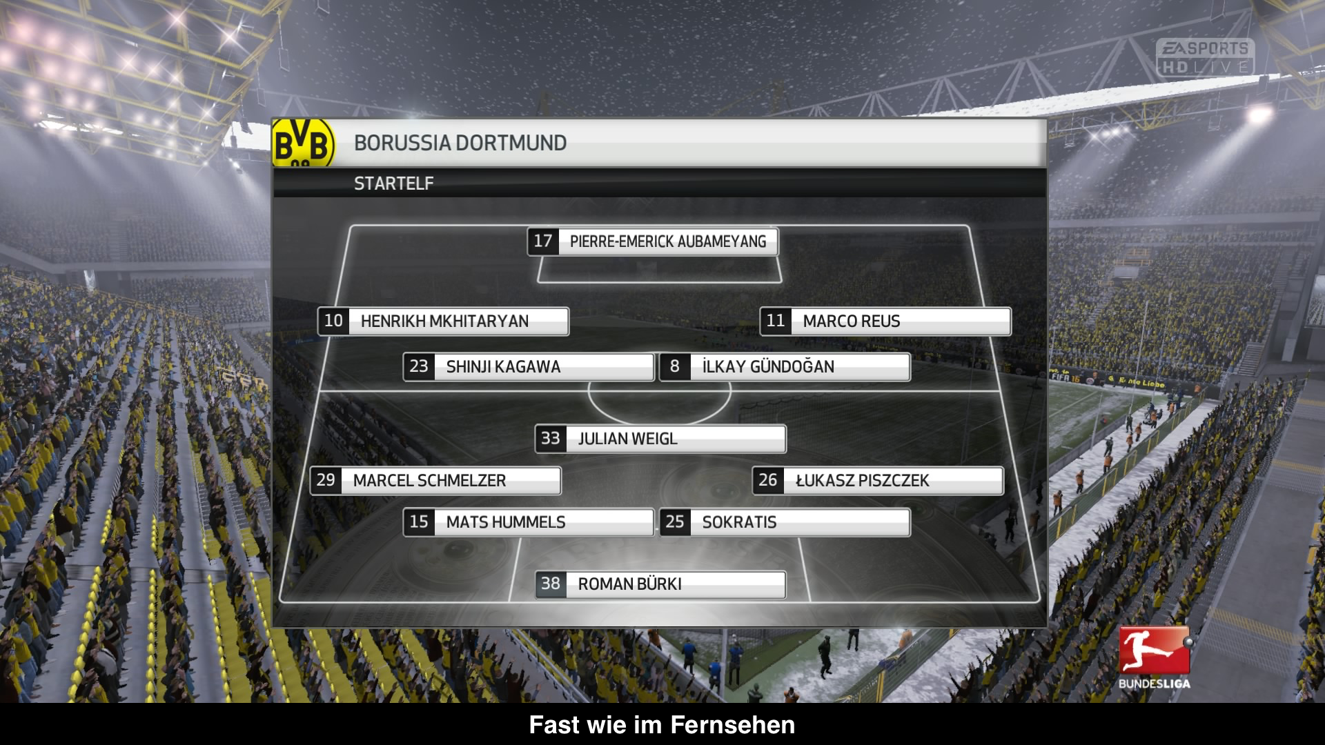 Deutlich besser gelungen ist die Aufmachung und Atmosphäre des Spiels. Wie nicht anders gewohnt ist extrem viel los auf dem Platz. Es gibt individuelle Jubel, 3D-Fans, Choreos und neuerdings auch eine lizenzierte Bundesliga. Das bedeutet der Spielstand oder die Startaufstellung wird genau so wie im PayTV angezeigt. Selbst die Halbzeitmusik wurde übernommen! Natürlich gibt es aber auch die Torlinientechnik oder das Freistoßspray. Weitere Änderungen finden sich im Wetter, wovon es nun mehr Einstellungsmöglichkeiten gibt. Statt Sonne, Schnee oder Regen gibt es jetzt auch noch Nebel oder Schneegestöber, wo sichtbar ist, wie mit der Zeit immer mehr Schnee auf dem Platz liegt. Leider sind die grafischen Effekte mehr als nur ausbaubar und dynamisches Wetter wäre wünschenswert. Ein absolutes Unding sind aber die Ladezeiten des Spiels in den Menüs. Nahezu jeder Klick in den Menüs löst eine mehrere Sekunden lange Ladezeit aus, die auf Dauer wirklich nervig sind.