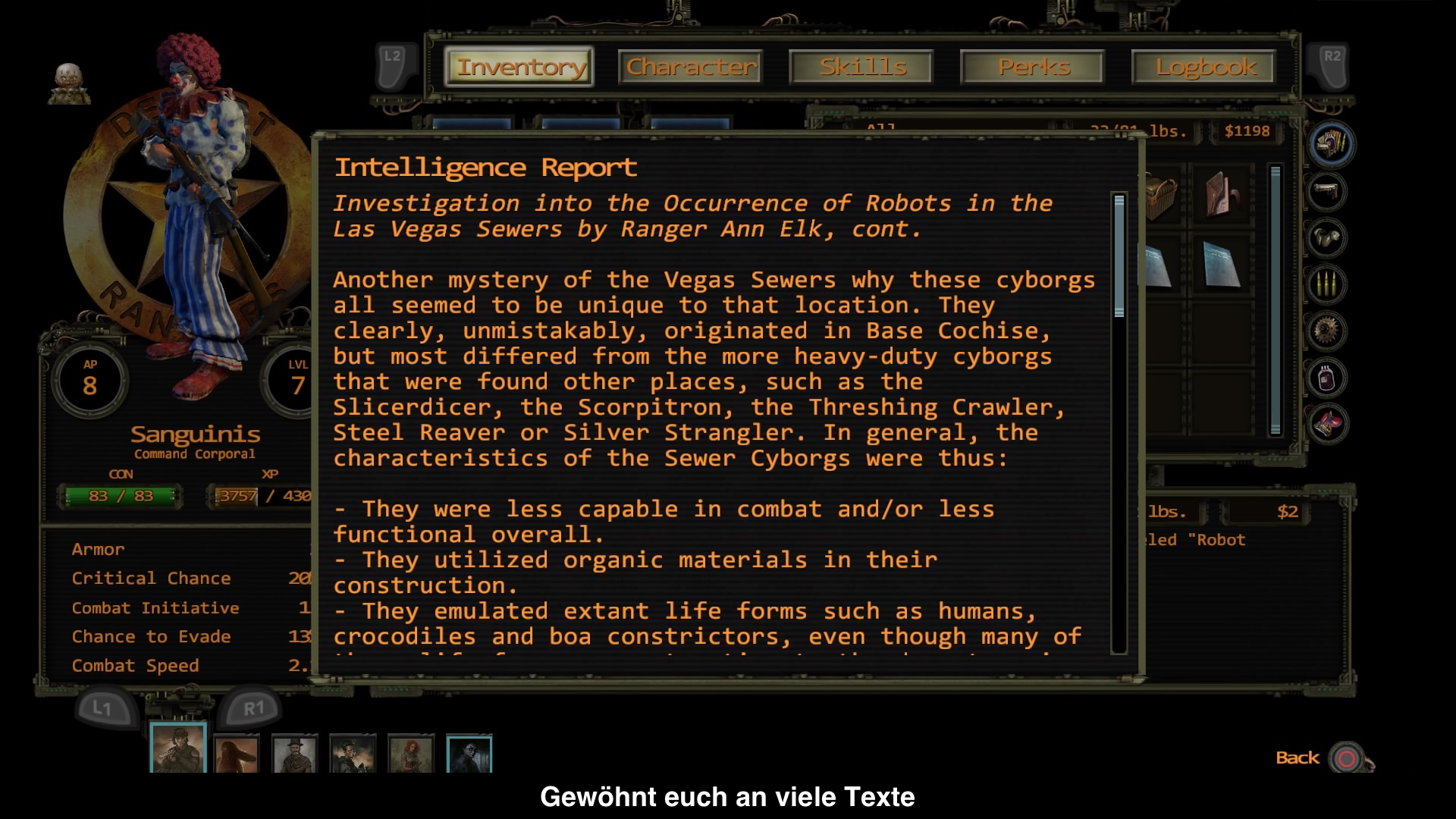 Zwischendurch folgen ein paar Tutorials über Kamera, Steuerung, Inventar und so weiter. Alles ziemlich Standard, wenn man noch das Interface von Fallout 1 und 2 vor Augen hat. Aber schnell fällt auf: Die Menüführung wurde vom PC einfach so übernommen und dann irgendwie auf die Buttons des Controllers gezwängt. Es sind zwar alle Funktionen zu erreichen und alles geht irgendwie, aber komfortabel geht anders. Teilweise ist schon ein wenig Arbeit an den Buttons nötig, um zum gewünschten Ergebnis zu kommen. Da merkt man, dass InXile keine Konsolenerfahrung hat. An die sehr saubere Menüführung eines Dragon Age Inquisition kommt Wasteland 2 nicht mal ansatzweise heran. Das Dialogsystem hingegen geht flüssig von der Hand. In einem Fenster wird der Text angezeigt und darunter stehen alle verfügbaren Themen als Schlagworte aufgeführt. Bei allen Systemen dieser Art ist es manchmal unvermeidlich, dass man etwas Falsches sagt, weil das angezeigte Schlagwort etwas anderes suggerierte. Das war bei Heavy Rain so, das ist bei Fallout 4 so - aber hier ist alles anders, da die komplette Antwort angezeigt wird, wenn ich das Stichwort markiere. Spart zwar weniger Platz, ist aber eine vernünftige Lösung.