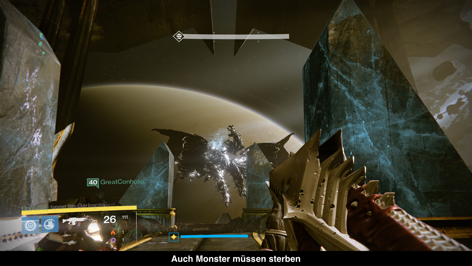 Die einzelnen Missionen aus Destiny wurden nun zu richtigen Questlines zusammengeschlossen. Im Deutschen werden sie als Suchen betitelt, aber ich denke mit Quests wird jeder wissen was gemeint ist. Der Ablauf der Missionen ist zwar immer noch recht ähnlich, aber die Motivation ist deutlich größer sie zu spielen, da man nun wirkliche Anweisungen bekommt. Tue dies und du rettest die Welt, dann tue das und du rettest die Welt schon wieder. Motivation ist wirklich einer der größten Pluspunkte von „König der Besessenen“, nie war es so interessant die Missionen zu spielen, speziell weil jetzt auch viel mehr coole Waffen oder Rüstungsteile auf einen warten. So gibt es ganze Questreihen, deren Ziel es ist Materialien zum Schmieden eines brachialen Schwertes zu besorgen und wird man dann erst einmal mit eben jener Klinge beglückt, weiß man wofür man gespielt hat.