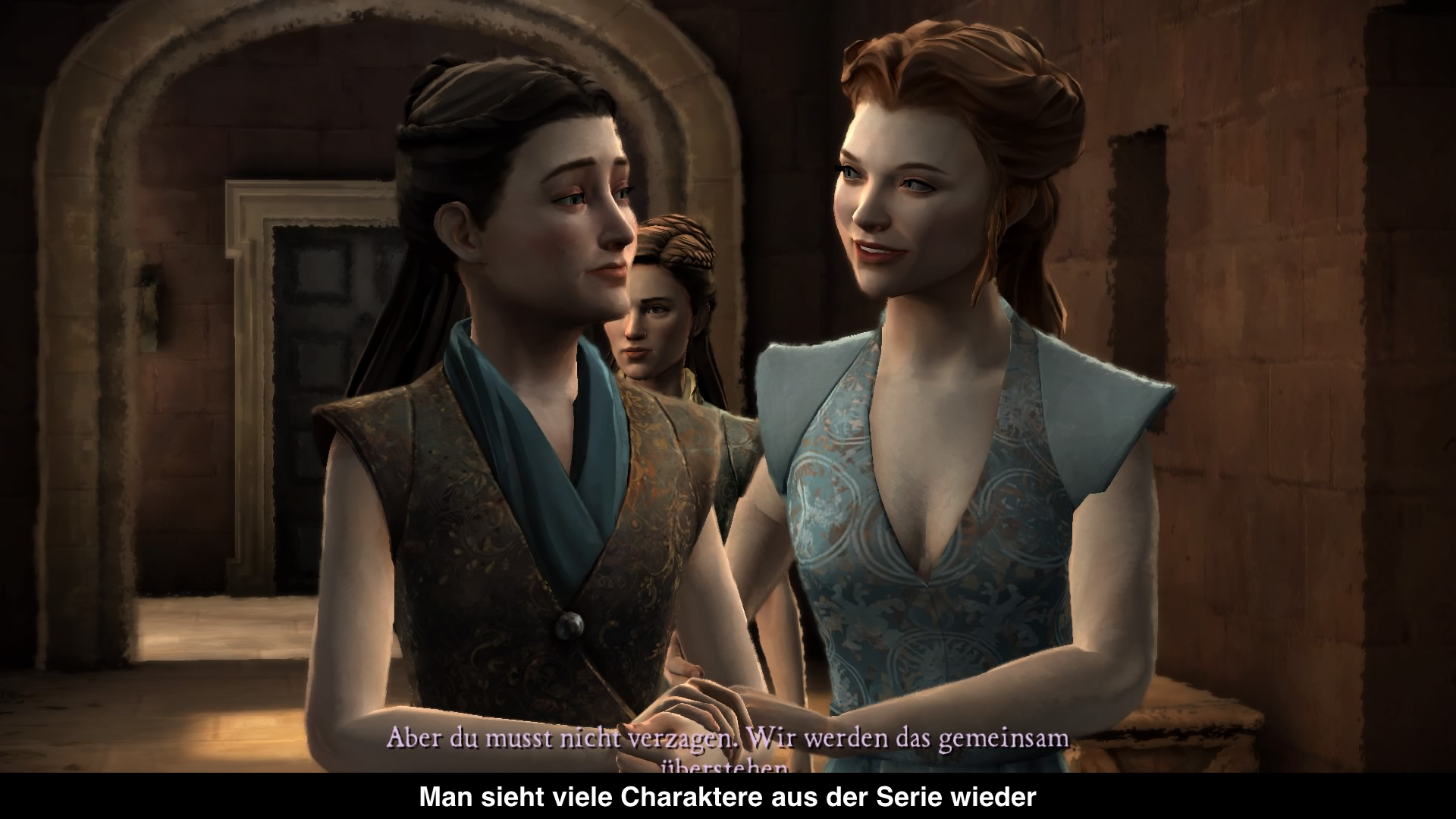 Grafisch hat man sich für Game of Thrones von dem Cell-Shading Stil der anderen Spiele gelöst und setzt auf klarere 3D-Charaktermodelle und eine Mischung aus Aquarell- und Pastelllook für Hintergründe. Letzteres wirkt aus der weiten Ferne wirklich hübsch, sobald man aber näher ran geht, sieht es eher wie eine sehr verwaschene Textur aus. In Kombination mit den normalen 3D-Modellen ist das Bild keinesfalls einheitlich gestaltet. Hinzu kommen dann noch hölzerne Animationen, die man bereits auf der PS2 besser gesehen hat. In einer Situation hat sich ein Charakter im Stand ohne Bewegung um die eigene Achse gedreht, um sich umzudrehen. Leider sind solche „Animationen“ kein Einzelfall. Immerhin läuft ansonsten recht sauber und nervige Ruckler konnten auf ein Minimum reduziert werden. Soundtechnisch bleibt das Spiel recht eindruckslos und die englischen Synchronstimmen machen ihren Job gut. Es gibt nämlich sogar die Sprecher aus der Serie für die Charaktere, die man bereits kennt.