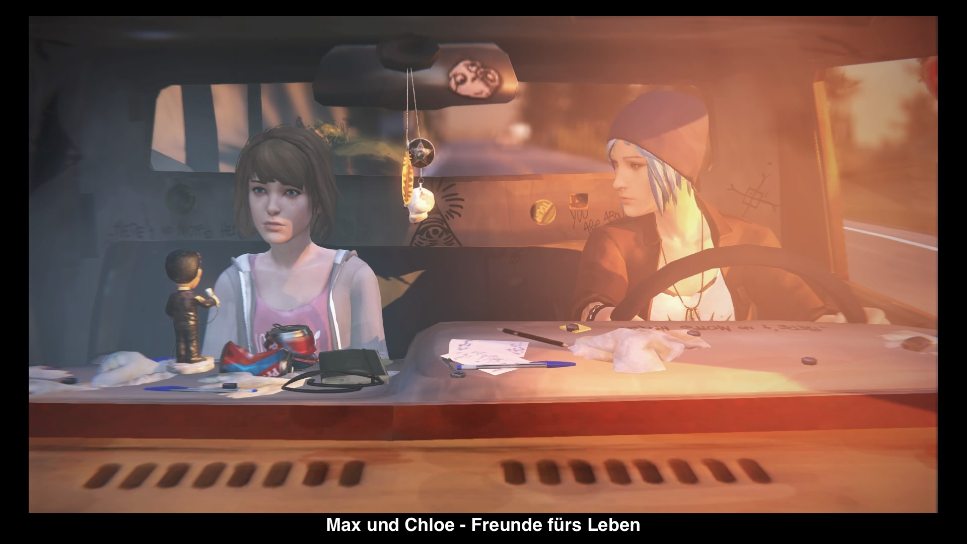 Aber um was geht es? Am besten kann man das Spiel als Mischung aus dem Film Donnie Darko und einer Coming of Age-Thematik beschreiben. Die Charaktere wurden gut in Szene gesetzt, die stylische Grafik überzeugt durch eine schöne Kolorierung und einem feschen Stil und die Dialoge und damit verbunden die Entscheidungen machen Laune. Klar, auch hier gibt es wie in den Telltale Spielen (Walking Dead usw.) nicht sonderlich viel Gameplay, aber eben deutlich mehr zu tun. Viele Sachen kann man untersuchen, Fotos machen und kleiner Rätsel lösen. Da ich die Serie zum Release der jeweiligen Episoden gespielt habe, kann ich keine wirklichen Längen ausmachen, pro Folge wird man rund 3 Stunden unterhalten. Einzig das Finale fällt etwas ab – und zwar nicht durch die krassen Enden, sondern eher durch das wirre Schleichspiel zuvor. Keine Ahnung, was sich die Entwickler dabei gedacht haben. Davon abgesehen, ist „Life is Strange“ ein sehr schönes und vor allem fesselndes Abenteuer, das Adventure und Film-Freunde gleichermaßen ansprechen sollte. Von mir gibt es jedenfalls kräftig Beifall für den gelungenen Mix und die spannende – ja mysteriöse – Story. Sollte man unbedingt gespielt haben!