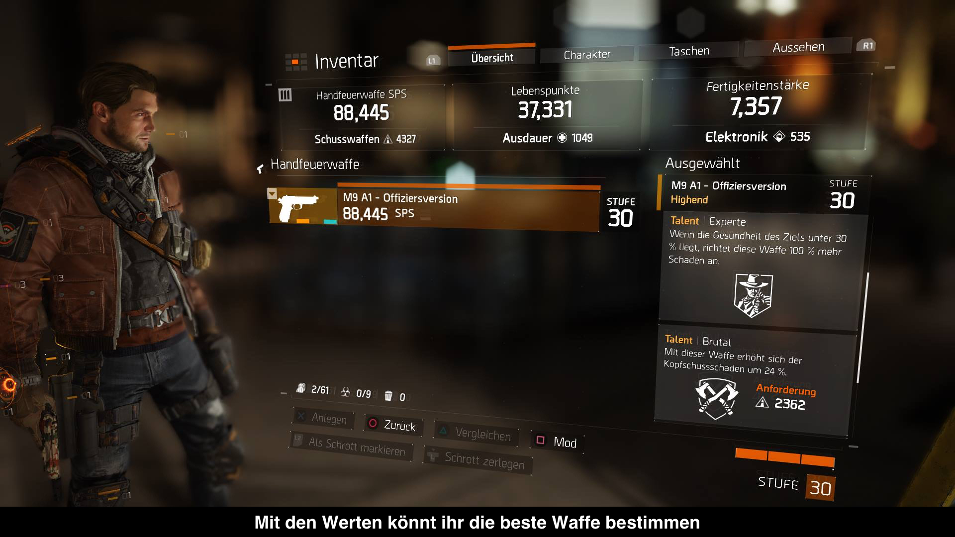 Nun, diese gibt es natürlich und unterteilen sich in Waffen, Aussehen und angelegte Ausrüstung. Was schon einmal positiv auffällt ist, dass das Aussehen keine Attribute hat, also man hat keine Jacke mit 500 Rüstung, sondern Jacken, Hemden, Hüte, Hosen, Schuhe und Schals sind rein kosmetisch und können einfach gewechselt werden. Bedeutet, die meisten Agents sehen anders aus, obwohl der Charakter-Editior sehr begrenzt ist. Angelegte Objekte, wie Holster, Rucksäcke, Handschuhe, Gasmasken, Knieschoner und Panzerwesten haben Rüstungswerte und verstärken je nach Güteklasse Schusswaffe, Ausdauer oder Elektronik. Zusätzlich können diese Gegenstände Talente haben wie z.B. 13% mehr Ausdauer, Schusswaffe und Fertigkeitsstärke. Zusätzlich können diese mit Mod-Plätzen kommen. Mods geben Ausrüstung noch einmal mehr Werte oder andere kleine Verbesserungen. Waffen sind halt Waffen, da gibt es von normalen Sturmgewehren bis hin zu Präzisionsgewehren nahezu alles, jedoch mit der Einschränkung, dass es keine Science-Fiction Waffen gibt. Waffen können dann noch einmal durch Aufsätze verbessert werden, also es kann die Magazingröße verbessert werden oder sogar der gesamte Waffenschaden erhöht werden. Zusätzlich zu alledem gibt es Rollenspiel typisch noch kritische Treffer, welche nur eine gewissen Chance haben und natürlich gibt es auch die guten alten Kopfschüsse, welche mehr Schaden machen, jedoch nicht sofort töten. Ausrüstung kann man in verschiedenen Güteklassen bekommen, einmal Weiß für abgenutzt, Grün für gewöhnlich, Blau für spezialisiert, Lila für überlegen und Gelb für High-End. In dem kommenden Update werden noch grüne Objekte eingeführt, dass sind dann Set-Gegenstände, welche auch besondere Fähigkeiten haben a la Diablo.