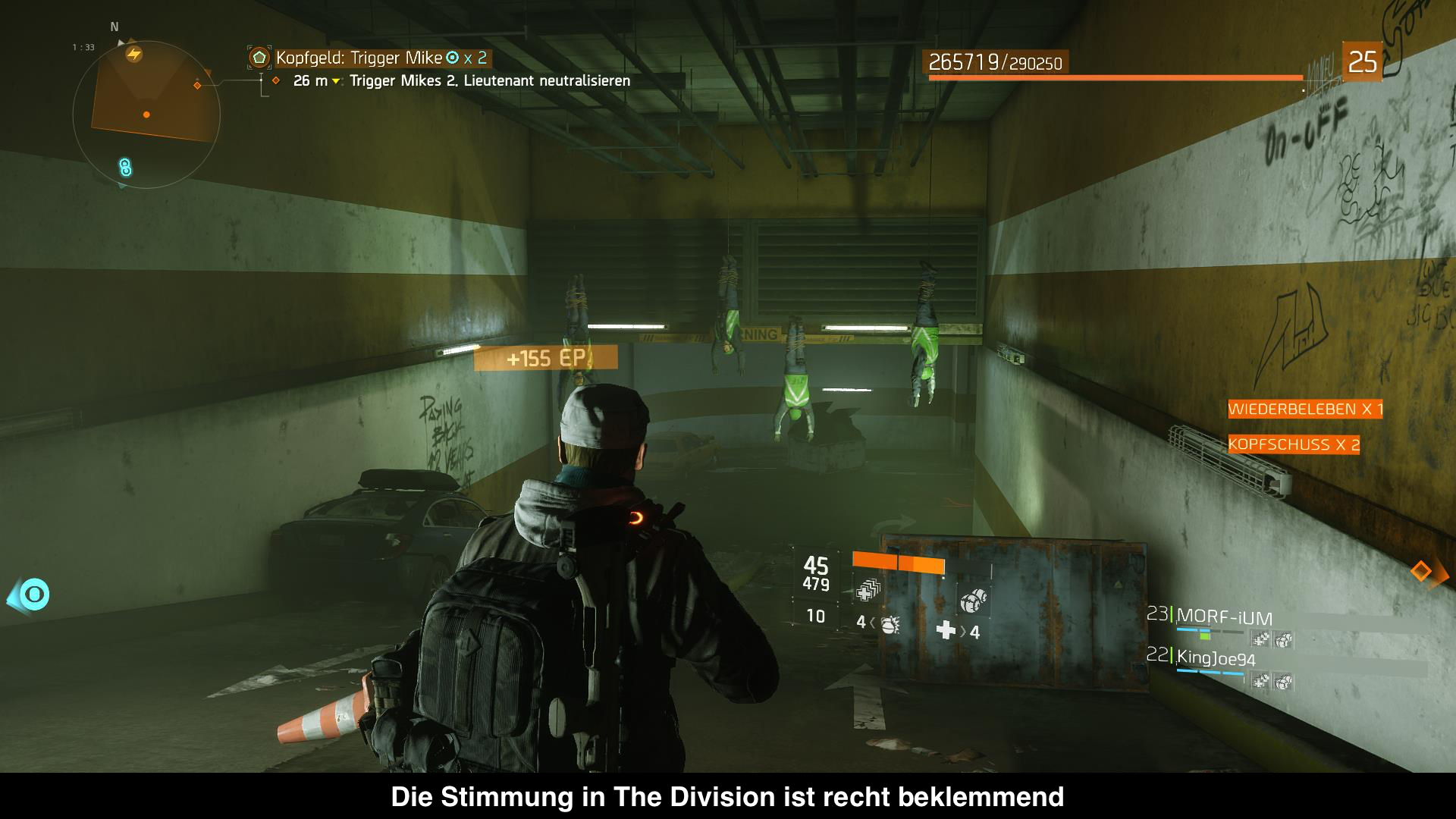 Zu erst einmal, „The Division“ ist nicht wie World of WarCraft. Man sucht sich also keinen Server aus und sieht auch nicht immer und überall andere Menschen. „The Division“ hat ist eine Shared World, dass bedeutet das man immer eine eigene Welt hat und man andere Spieler in seine Gruppe einladen kann und so auch seine Welt teilen kann. Also kann ich die Story mit einer 4er Gruppe bestreiten, aber halt nur in meiner Welt, wobei die gemachten Missionen auch für alle anderen Spieler der Gruppen abgehakt werden. Natürlich kann man auch gegen andere Spieler mit seiner Gruppe antreten, dass jedoch nicht in klassischen Multiplayer-Modi wie Team Deathmatch, sondern man findet sich in der Dark Zone wieder. In der Dark Zone geht es darum, Ausrüstung und Crafting-Material zu sammeln. Jedoch mit einem Haken, man ist nicht nur mit seiner 4er Gruppe unterwegs, sondern auch mit anderen Spielergruppen. Diese müssen jedoch nicht feindlich sein. Falls man aber doch mal Spieler tötet, um diese von ihren in der Dark Zone gesammelten Gegenständen zu befreien, wird man abtrünnig. Dies bedeutet, man kriegt einen Timer mit einem Totenkopf und ist für diese Zeit Freiwild für andere Spieler. Falls man, dann doch wirklich viele Gegner gekillt hat, kommt man zum „Fahndungslevel“ Menschenjagd. Da wird man als Missionsziel angezeigt und der Spieler der einen tötet, kriegt viel in Game Währung und XP für die Dark Zone.
