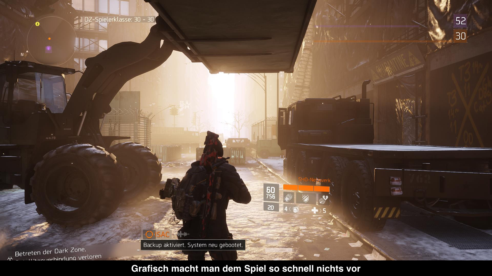 Die Dark Zone folgt jedoch eigenen Regeln, dass bedeutet, man hat einen Dark Zone Rang, welcher steigt und fällt, genauso gibt es eine eigene Währung, welche man auch wieder verlieren kann. Genau! Man kann Sachen verlieren. Dies gilt für Gegenstände, Währung und Erfahrungspunkte. Man kann sogar wieder im Level fallen, jedoch verliert man nur beim Tod diese Sachen und es wird alles global fallen gelassen. Das bedeutet, jeder kann einem die Sachen dann wieder wegnehmen, falls man diese nicht selber aufsammelt. Die Gegenstände müssen sogar aus der Dark Zone ausgeflogen werden, da diese vom Virus kontaminiert sind und es können aktuell gesammelte Gegenstände auch wieder fallengelassen werden. Man erkennt außerdem an den gelben Container auf dem Rücken der Agenten, ob Gegenstände gesammelt wurden. Das bedeutet allerdings auch, dass alle anderen sehen können, dass man etwas gesammelt hat und man so auch zum Ziel von räuberischen Spielern werden kann.