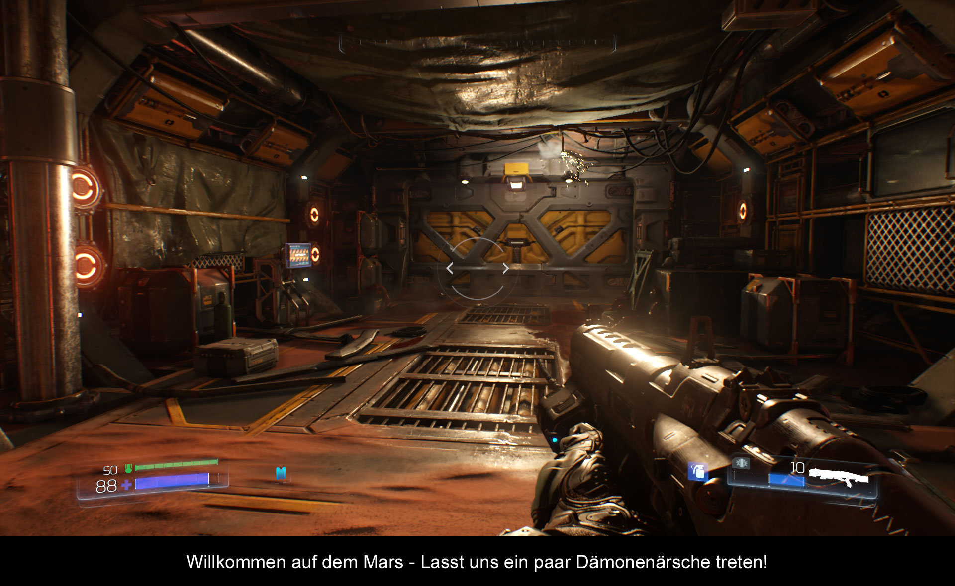 Die Story in DOOM ist quasi zu Anfang nicht existent. Es gibt da am Anfang einen Punkt, in welchem Story aufkommt. Denn es wird versucht zu erklären, was passiert ist. Doch der Hauptcharakter tritt den Bildschirm um, lädt seine Waffe durch und tötet einfach weiter. Doch wer jetzt denkt, es kommt keine Story auf, der hat sich geschnitten. Denn später erfährt man mehr über den Hauptcharakter und es wird erklärt, was auf dem Mars passiert ist. Aber zu viel Hoffnung sollte man sich auch nicht machen, was die Story angeht, denn es ist kein über inszeniertes Action-Spektakel, wie Call of Duty, in dem ein General einem alle zwei Minuten ins Ohr brüllt, was man zu tun hat, und wer die Bösen sind.