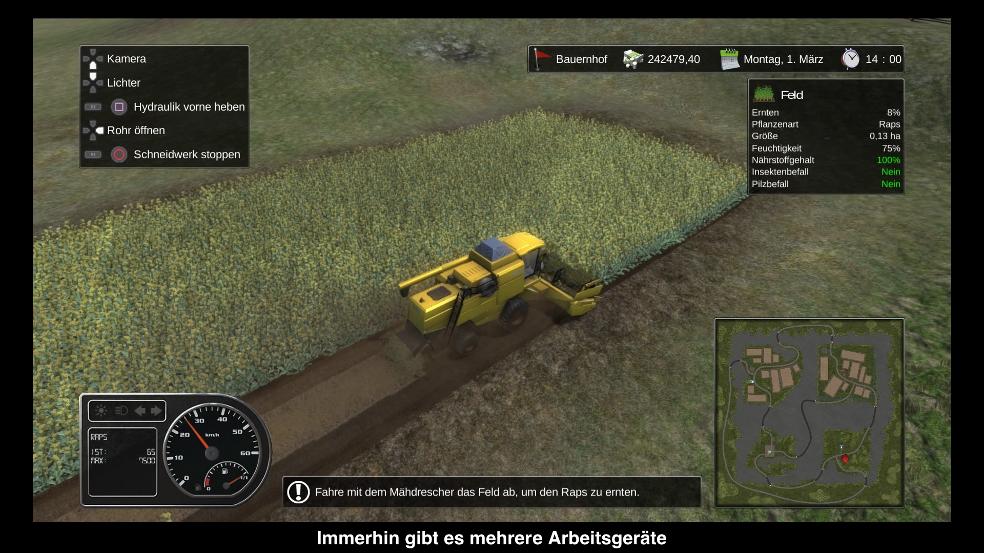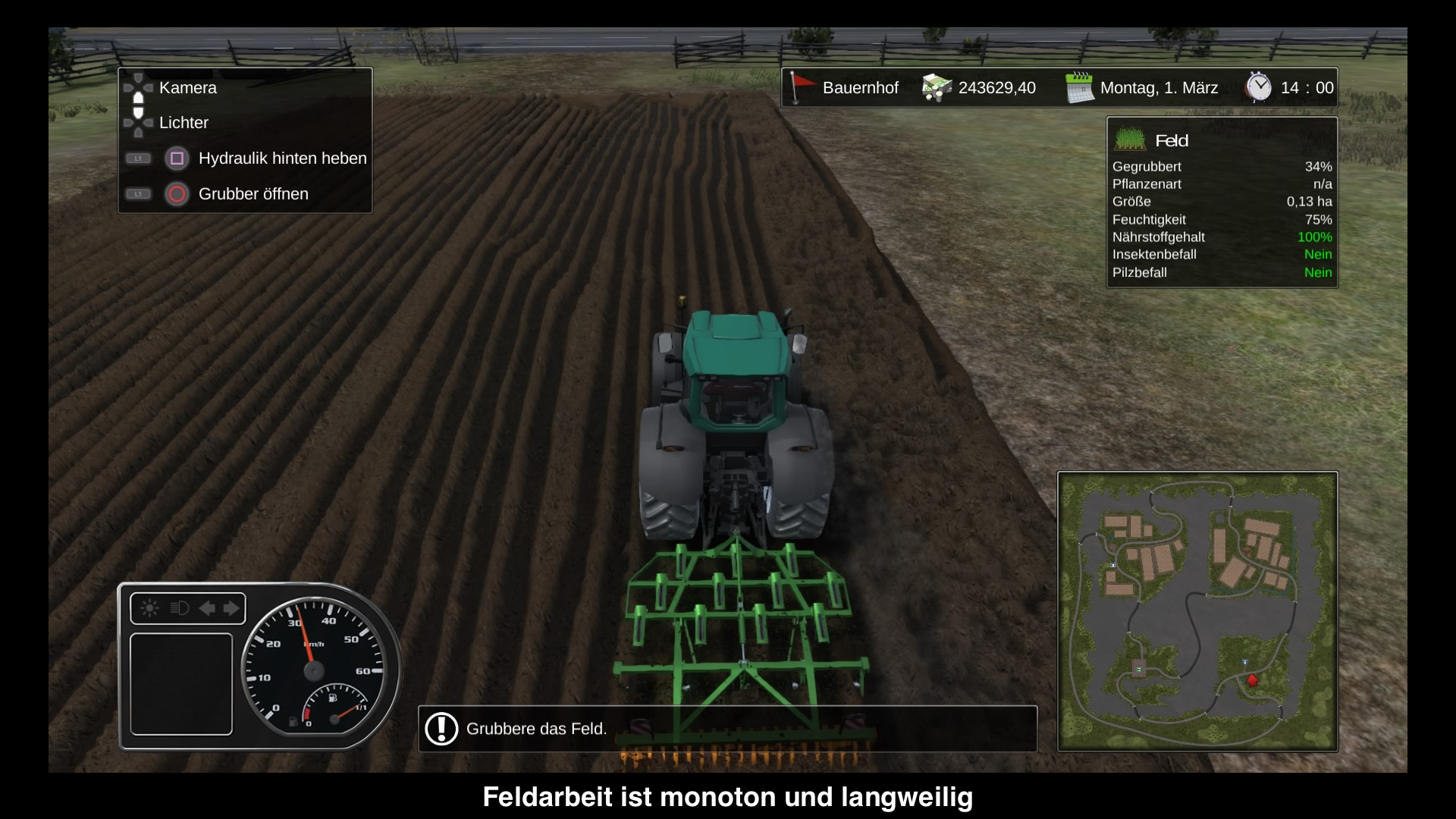 Wer eine Geschichte erwartet, wird hier enttäuscht. Aber das sollte auch nicht wirklich überraschen, da der Alltag eines Bauern keine Freizeit für unwichtiges Geplänkel vorsieht. So stürzt euch das Spiel direkt ins Spielgeschehen auf einen Bauernhof, wo ihr bereits ein paar Gerätschaften besitzt. Es steht ein Traktor herum, ein Mähdrescher, ein Pflug und noch mehr. Als erstes macht man sich dann auf die Suche nach einem Feld, welches man kaufen möchte und dann beginnt der „Spaß“. Man nimmt das richtige Gerät und bearbeitet anschließend das Feld. Erst wird gepflügt, dann das Feld gelockert, der Samen gesät und nach ein paar Wochen darf man das Ergebnis seiner harten Arbeit ernten. Harte Arbeit ist hier genau das richtige Wort, denn es gibt wirklich wenig was einem Freude bereitet. Die Arbeitsschritte sind immer die selben und äußerst monoton. Da hilft es auch nicht, dass man auf seinem Bauernhof auch Tiere halten kann, die dann gefüttert werden müssen usw. Unterm Strich läuft alles auf einen absolut monoten und langweiligen Tag hinaus. Es gibt keine unterschiedlichen Jahreszeiten, keine Abwechslung, nichts abseits des Bestellen von Feldern zu tun und letztlich jagt man nur selbst gesetzten Zielen nach. Das Spiel selbst wirft einen ins Spiel und lässt euch dort dann versauern. Übrigens gibt es eine halboffene Welt, die jedoch völlig leer ist. Keine anderen Menschen, keine Fahrzeuge auf den Straßen, keine anderen Landwirte, nichts.