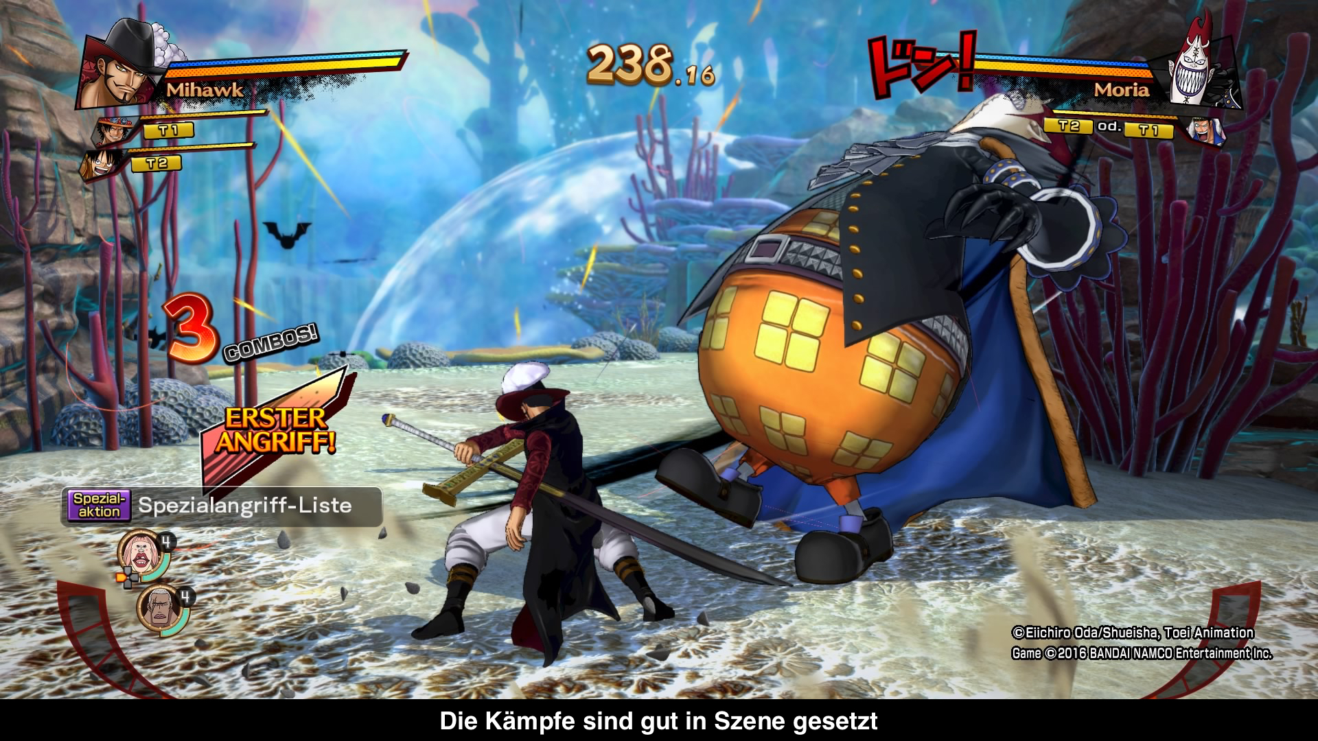Die Kampfarenen stammen aus verschiedenen Handlungsschauplätzen, unteranderem von der Entscheidungsschlacht, der Fischmenschen Insel und Dressrosa. Jede weist eine zerstörbare Umgebung auf, hat aber keinen Einfluss auf den Kampf. Als optisches Zuckerl gibt es dafür eine eigene Animation, wenn man den Gegner mit einem mächtigen Schlag aus dem Ring befördert. Für die Musik gibt es wieder einen lizensierten Soundtrack aus dem Anime wie auch Eigenkompositionen. In allem sehr stimmig. Sprachausgabe ist in Japanisch, Texte wurden ins Deutsche Übersetzt. Das Minimum was man sich für eine Lokalisierung erwarten kann. Zumindest hat sich eine Person darum gekümmert, welche in der One Piece Welt bewandert ist.