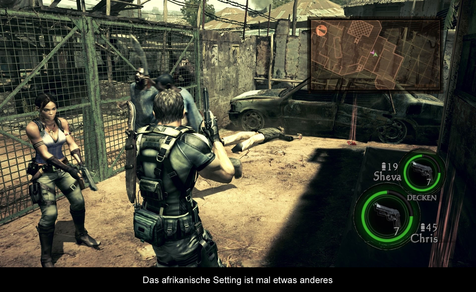 Im Mittelpunkt der Geschichte stehen Chris Redfield und Sheva Almomar, die im Auftrag (der inzwischen allseits bekannten) BSAA, einen neuen Virus-Vorfall in Afrika untersuchen sollen. Serientypisch dauert es aber natürlich nicht lange, bis die sprichwörtliche „Kacke am Dampfen“ ist. So entwickelt sich im Laufe der zahlreichen Kapitel eine packende Geschichte, die auch ausgiebig vom „Lore“ der Serie gebraucht macht. Ich persönlich finde es jedoch immer noch schade, wie sich die Serie damals, beginnend mit dem vierten Teil, von den klassischen Zombies entfernt hat. Und auch wenn man es mit zahlreichen Gegnervariationen zu tun bekommt, kennt man viele schon in ähnlicher Form aus dem vierten Teil. Und nachdem Resident Evil 4 wenigstens hier und da einige Rätselpassagen angeboten hat, liegt der Fokus beim 5. Teil inzwischen eindeutig mehr auf der Action. Es wird viel geballert und bei den zahlreichen QTE-Events, viel auf den Controller eingehämmert. Nach wie vor gewöhnungsbedürftig ist jedoch die altbackene Panzer-Steuerung, die es einem nicht erlaubt, während des Laufens zu schießen. Was im Jahr 2009 schon nervig war, ist fast 10 Jahre später sogar noch unerträglicher, vor allem in Hinblick auf die zahlreichen Gegner, mit denen man es zu tun bekommt. Zum Ausgleich gibt es bei RE5 jedoch einen Partner, der im Offline-Modus von der KI und im Online-Modus von einem menschlichen Spieler gesteuert wird. Und hier kommt die stärkste Seite von Resident Evil 5 zum Vorschein. Obwohl Resident Evil 5 spielerisch altbacken und alles andere als innovativ ist (auch damals schon), kann das Ko-Op-Vergnügen selbst heute noch vollends überzeugen. Es macht einfach Spaß sich gemeinsam mit einem Kumpel durch die Mengen an Gegner zu ballern und einander bei heiklen Situationen zu helfen. Nur offline kommt es hin und wieder zu einigen frustrierenden Momenten, da Sheva immer noch an einer mäßigen intelligenten KI leidet.
