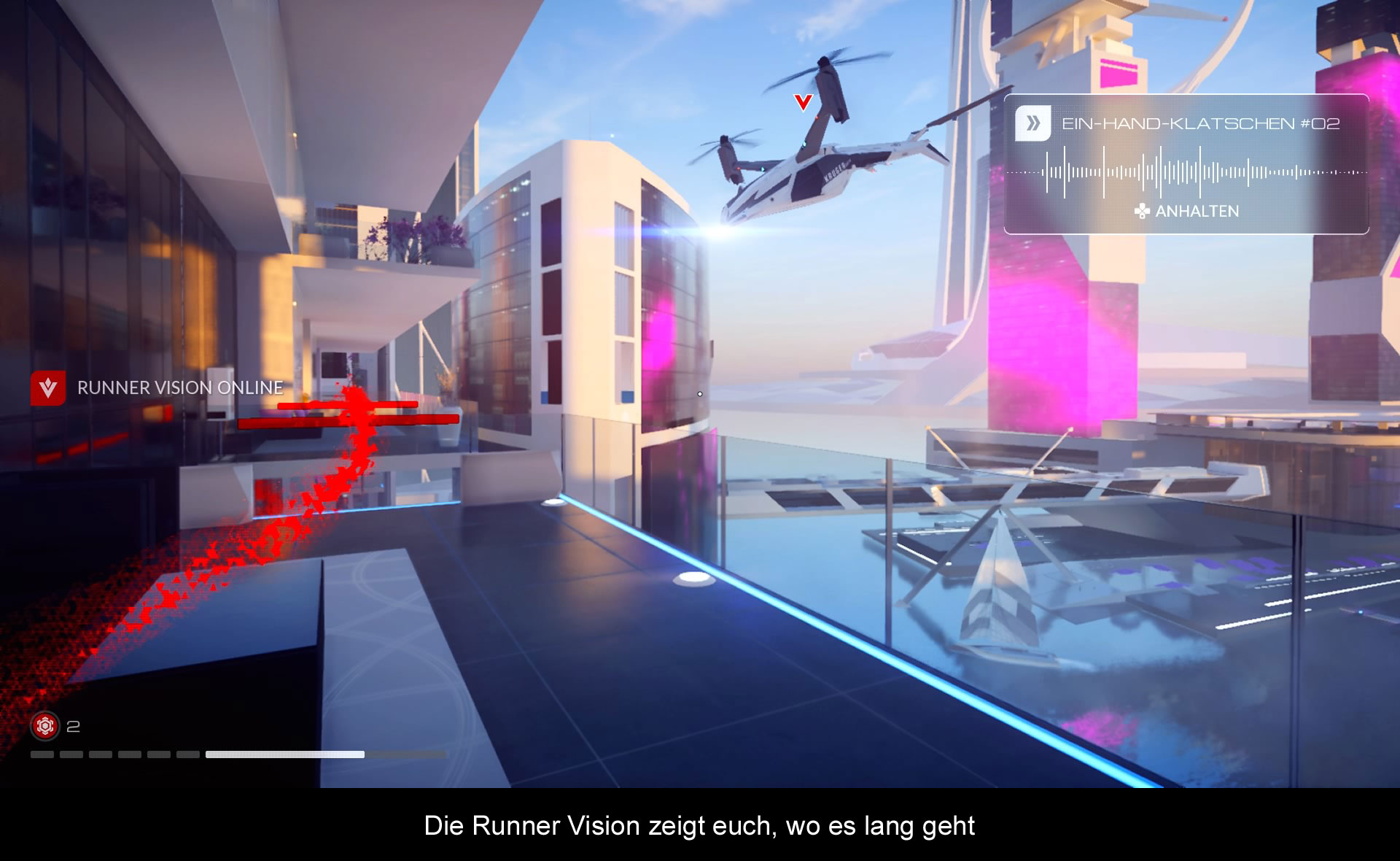 Visuell behält „Catalyst“ den Stil des Vorgängers bei. Die Optik der Zukunft verspricht viele weiße Flächen und farbige Tupfer in der Sterilität der Langeweile. Nach wie vor, bewegt man sich fast nur auf den Dächern der Stadt und dort tut sich halt relativ wenig. Dazu kommt, dass man sich nun in einer offenen Spielwelt wiederfindet und dementsprechend häufig unterwegs ist, sei es von einer Mission zur Nächsten oder auf der Suche nach Nebenaufgaben bzw. Herausforderungen. Damit man sich nicht verläuft, gibt es wieder die Runner Vision (kann auch abgeschaltet werden), die einem den „besten“ Weg zum Ziel aufzeigt. Während im Vorgänger das vor allem noch intuitiv durch farbige Akzente in der Umgebung bewirkt wurde, muss man sich jetzt auf eine direktere Navigation einlassen. Liegt aber auch daran, dass man statt gut entworfenen linearen Levels nun oftmals große Gebiete durchqueren muss und ja, hier gibt es genügend „Dead Ends“.