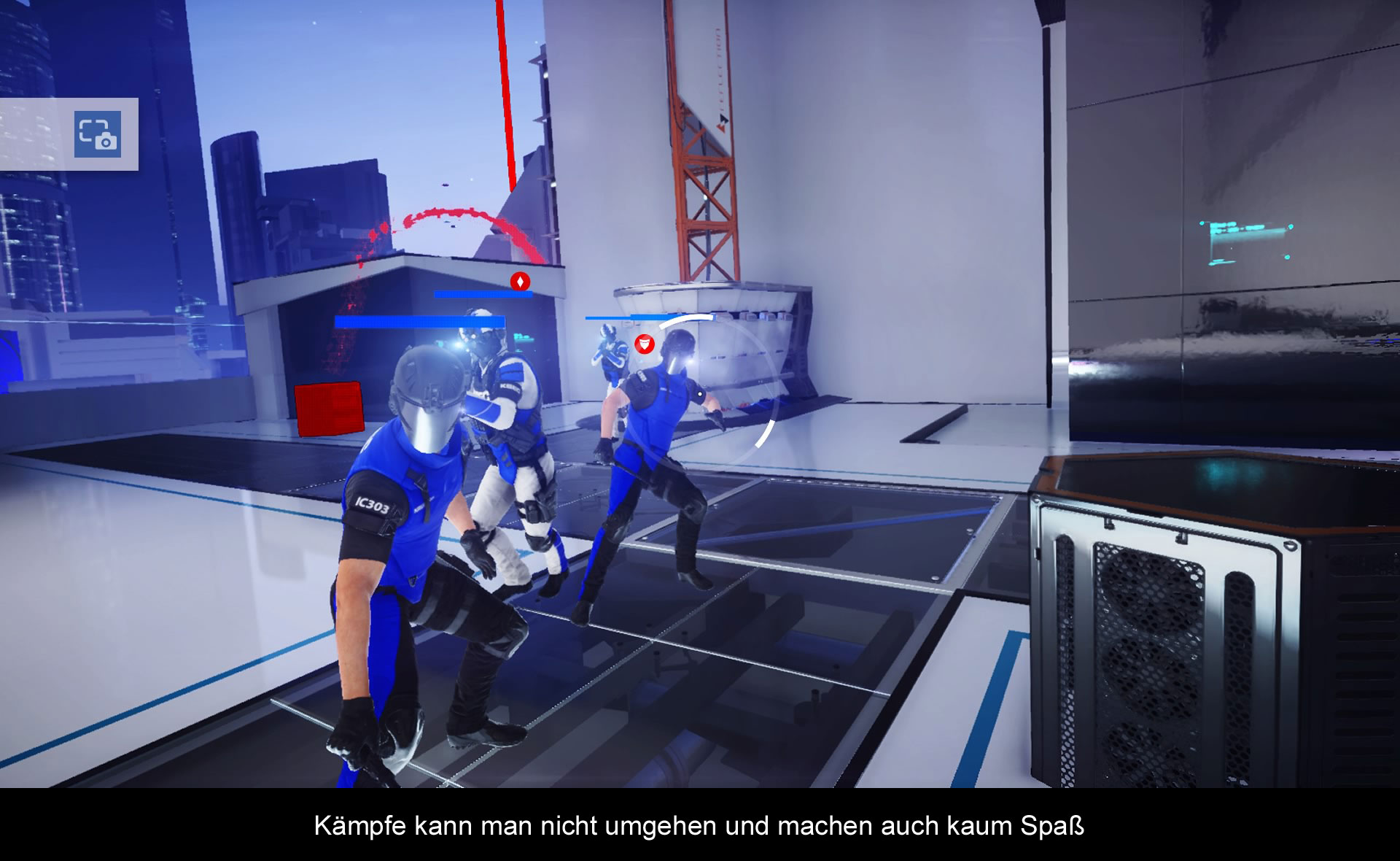 Kämpfe gibt es übrigens immer noch: Nur dieses Mal nimmt Faith lediglich ihre Fäuste und Füße zur Hilfe. Die Ego-Shooter Parts aus dem Vorgänger sind Geschichte. Aber das bedeutet nicht, dass die Sicherheitsleute von K-Sec euch in Ruhe lassen. Noch immer muss man sich mit gepanzerten Soldaten rumschlagen, die ihre Sturmgewehre sofort ziehen und euch abknallen wollen. Selbst in einer modernen totalitären Zukunft sollte das etwas – nun ja weniger platt gelöst sein. Alternativ werden auch Drohnen eingesetzt, um Faith zu verfolgen. Den fliegenden Überwachungsapparaten sollte man schleunigst aus dem Weg gehen, ansonsten wird man auch hier gnadenlos eliminiert. Das kann durchaus ätzend werden, da man in der offenen Welt erstmal die entsprechenden Wege finden muss und dadurch schnell in einer Sackgasse landen kann bzw. in die Tiefe stürzt. Letztlich wird auch in „Catalyst“ viel – in meinen Augen zu viel – Wert auf Action gelegt und an manchen Stellen darf man sich mit ganzen Horden von Feinden rumschlagen. Da hilft es auch nicht, dass das Kampfsystem einfach gehalten wurde. Stattdessen wird’s dadurch noch eintöniger.