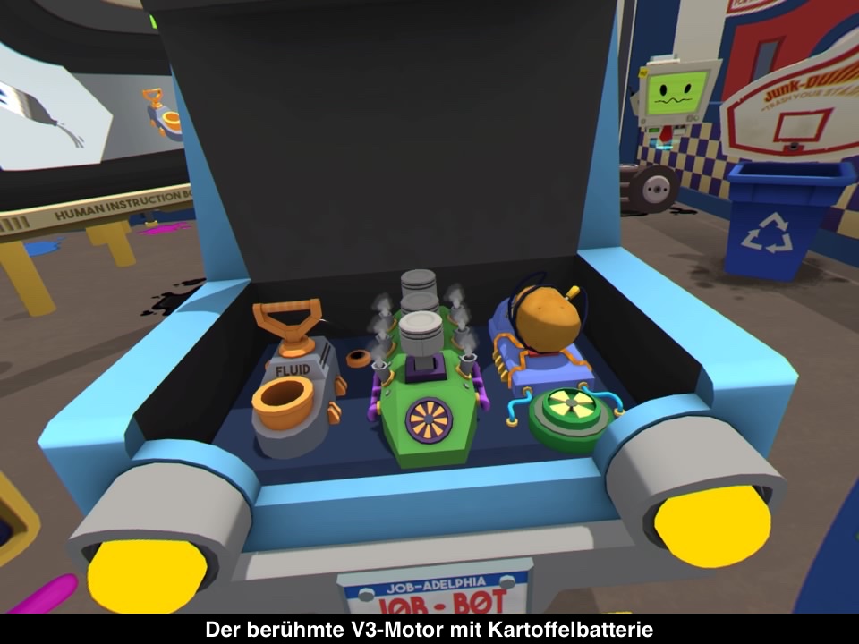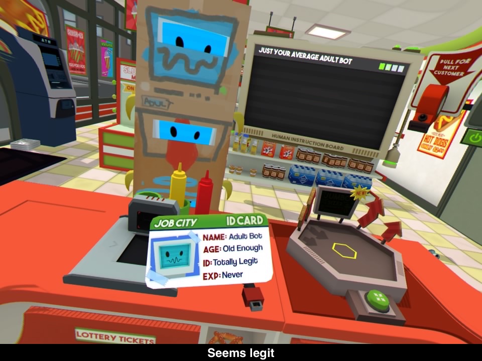 Insgesamt bietet Job Simulator vier Arbeitsplätze. Ihr könnt also als Koch eines Restaurant, als Verkäufer eines kleinen Ladens, als Automechaniker oder in einem Büro arbeiten. Jeder Arbeitsplatz bietet ein kompaktes Umfeld, in dem ihr euch, ohne zu Bewegen, vergnügen könnt. Dabei gibt es immer wieder Aufgaben zu meistern, wie ein spezielles Sandwich zuzubereiten, der alten Dame die Einkäufe in eine Tüte zu legen oder die Geschäftsbilanz des Unternehmens etwas zu frisieren. Die Aufgaben sind alle recht offensichtlich und werden mit viel Humor präsentiert. Nebenbei gibt es aber auch allerlei anderes Zeug, was ihr machen könnt. Nahezu alles in eurem Umfeld kann manipuliert werden, was wirklich zum Ausprobieren einlädt. Leider funktioniert das Tracking der Move-Controller nicht immer ganz perfekt. Mal klappt das Greifen nicht, dann sind gewisse Dinge außer Reichweite und manchmal gibt es auch Bugs, die den Fortschritt verhindern. Da hilft dann nur ein Neustart des Spiels. Leider bieten die Aufgaben in dem jeweiligen Tätigkeitsfeld auch nicht allzu viel Abwechslung. Was zu Beginn noch Spaß macht, wird irgendwann wirklich zu nerviger Arbeit. Wenn man alle Jobs beenden möchte, benötigt man ungefähr zwei Stunden.