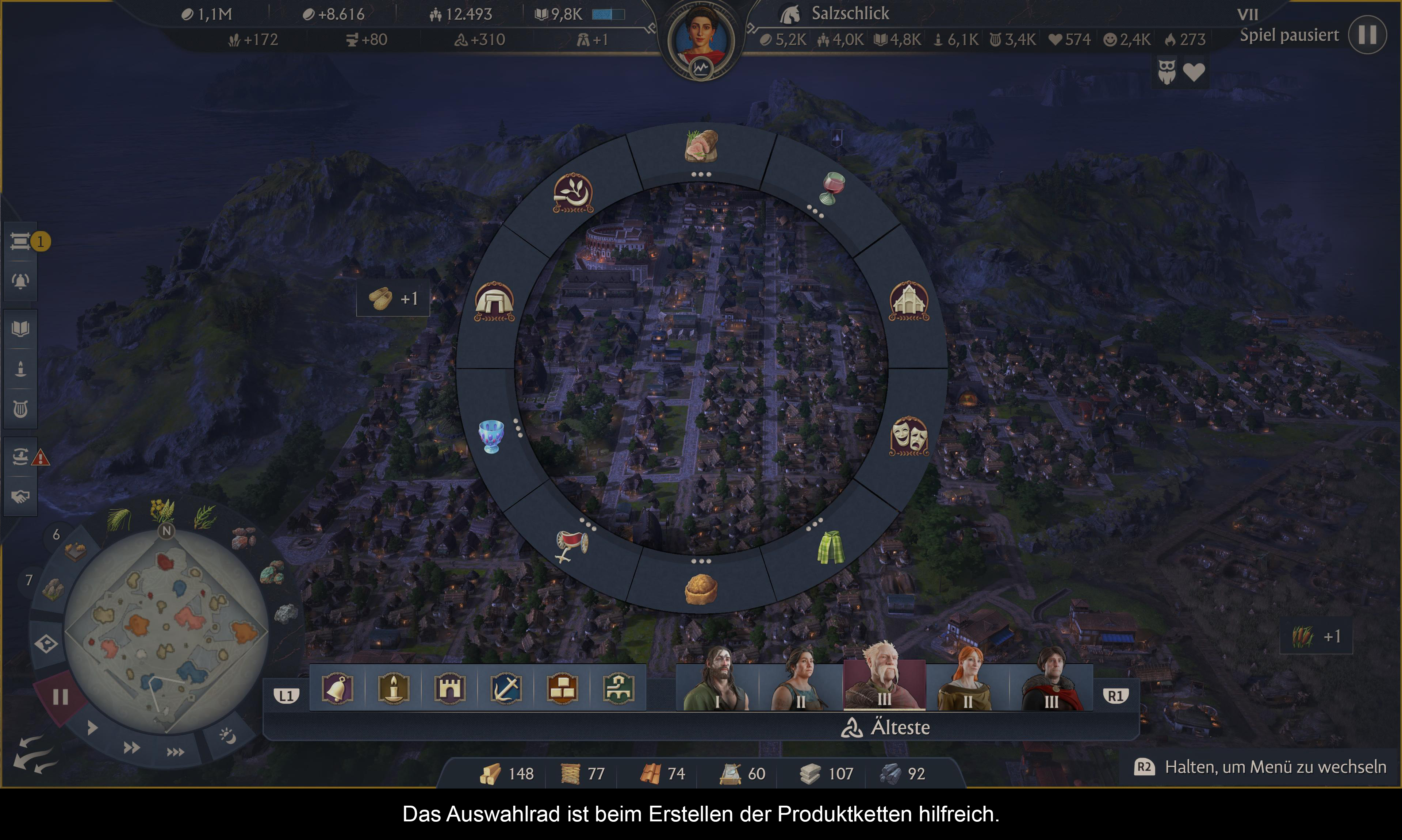 Was die Steuerung betrifft, kann ein PS5 Controller nicht mit einer Maus und Tastatur Kombination mithalten. Auf den ersten Blick scheint einem die Steuerung zu erschlagen und die Controller Erklärung wird aus gutem Grund im Pause Menü angezeigt. Wenn man aber das Grundsystem erstmal versteht, eröffnet sich ein überraschend flüssiges Erlebnis. Die wichtigsten Tasten sind L2 und R2. Bei L2 öffnet sich ein Quickmenü welches alle Basis Befehle hat um schnell Strukturen zubauen, verschieben oder zu bearbeiten. Wer will, kann hier die Befehle sogar individuell belegen. Bei R2 öffnet sich das Bau und Truppenmanagment Menü. Bei Bauen kann man mit L1/R1 durch die verschiedenen Gebäudetypen und Bevölkerungen durschalten. Danach wird wieder über ein Rad Menü gewählt. Man wählt das zu erzeugendes Produkt aus und findet in einem separaten Fenster die dazugehörenden Gebäude. Mit dem Steuerkreuz wählt man diese aus und platziert sie. Das es derart einfach geht, ist der neuen Umstrukturierung des Bausystems zu verdanken. Dies macht es selbst auf Konsolen einfach schnell und unkompliziert die Anno typischen Warenketten zu positionieren. Mit Kopieren (L2) lassen sich schnell mehre Typen dann positionieren. Auch das Straßennetz ist schnell gebaut, da es Strukturen automatisch erkennt und nun auch diagonal bauen kann. Leider ist die Auswahl der verschiedenen Schiffe und Truppen nicht so gut gelöst. Dies ist sehr fummelig. Auch hier merkt man, dass der Kampf nicht unbedingt das Hauptaugenmerk ist.