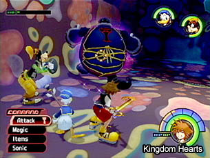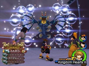 Das Spielgeschehen orientiert sich, wie nicht anders zu erwarten war, an dem des Vorgängers. So benutzt ihr den linken Analogstick, um euren Charakter zu bewegen und den Rechten zum Justieren der Kamera. Obwohl ihr eigentlich fast immer zu dritt unterwegs seid, steuert ihr lediglich den Hauptcharakter Sora. Um die anderen Kämpfer kümmert sich die durchaus zufrieden stellende KI. Die eigentlichen Kämpfe finden im Gegensatz zu den Final Fantasy Spielen in Echtzeit statt. Das Kampfsystem von Kingdom Hearts II ist jedoch alles andere als anspruchsvoll, obwohl man bei den vielen „Features“ anders denken könnte. Die meiste Zeit haut ihr nämlich nur permanent auf die X-Taste, mit der ihr die Standardattacken aktiviert. Damit das Ganze aber nicht all zu langweilig wird, könnt ihr im Hauptmenü diverse Abilities aktivieren. Befindet ihr euch zum Beispiel in einem Areal, wo es hauptsächlich fliegende Gegner gibt, sind vor allem Luft-Combos eine gute Alternative. Nichtsdestotrotz bleibt es fast immer nur beim sturen Drücken der X-Taste. Abwechslung gibt es lediglich in Form der ab und zur auftretenden Situations-Kommandos, bei denen ihr mit einem Druck auf die Dreiecks-Taste eine speziellen Super-Combo ausführen könnt. Gerade bei den stellenweise ziemlich happigen Zwischen- und Endgegnern bilden diese Combos immer eine wichtige Grundlage, um den Schurken schließlich zu besiegen. Eine Neuerung im Kampfsystem stellt dagegen die so genannte Drive-Leiste da. Gelingt es euch, diese mit Hilfe von unzähligen Standardschlägen aufzufüllen, könnt ihr für kurze Zeit in eine spezielle Sonderform wechseln (Helden-, Weisen- und Meisterform). Doch Obacht: Wechselt ihr in eine andere Form, müsst ihr für die gleiche Zeit auch auf eure Gefährten verzichten. Wer sich dem aber bewusst ist, der darf sich für einige Sekunden über einen Geschwindigkeits- und Angriffsboost freuen. Neben der Drive-Leiste existiert aber auch noch eine zweite Spezialattacke, die ihr unter dem Punkt „Rufen“ anwählen könnt. Mit Hilfe dieser Funktion eilt euch für kurze Zeit ein zusätzlicher Disney Charakter an die Seite, der euch dann tatkräftig unterstützt. Im Großen und Ganzen erinnert dies ein wenig an die Bestia Rufe aus den Final Fantasy Spielen. Gleiches gilt im Übrigen auch für die Magieattacken. Hier erwarten euch nämlich die altbekannten Zauber Vita, Feura und Konsorten. Deswegen solltet ihr auch immer einen Blick auf die Mana Leiste werfen, die sich recht schnell verbraucht. Nun stehen euch zwei Möglichkeiten zum Füllen zur Verfügung: Entweder greift ihr auf das altbekannte Äther zurück, oder ihr wartet einfach, bis sich die Leiste wieder von alleine aufgeladen hat.