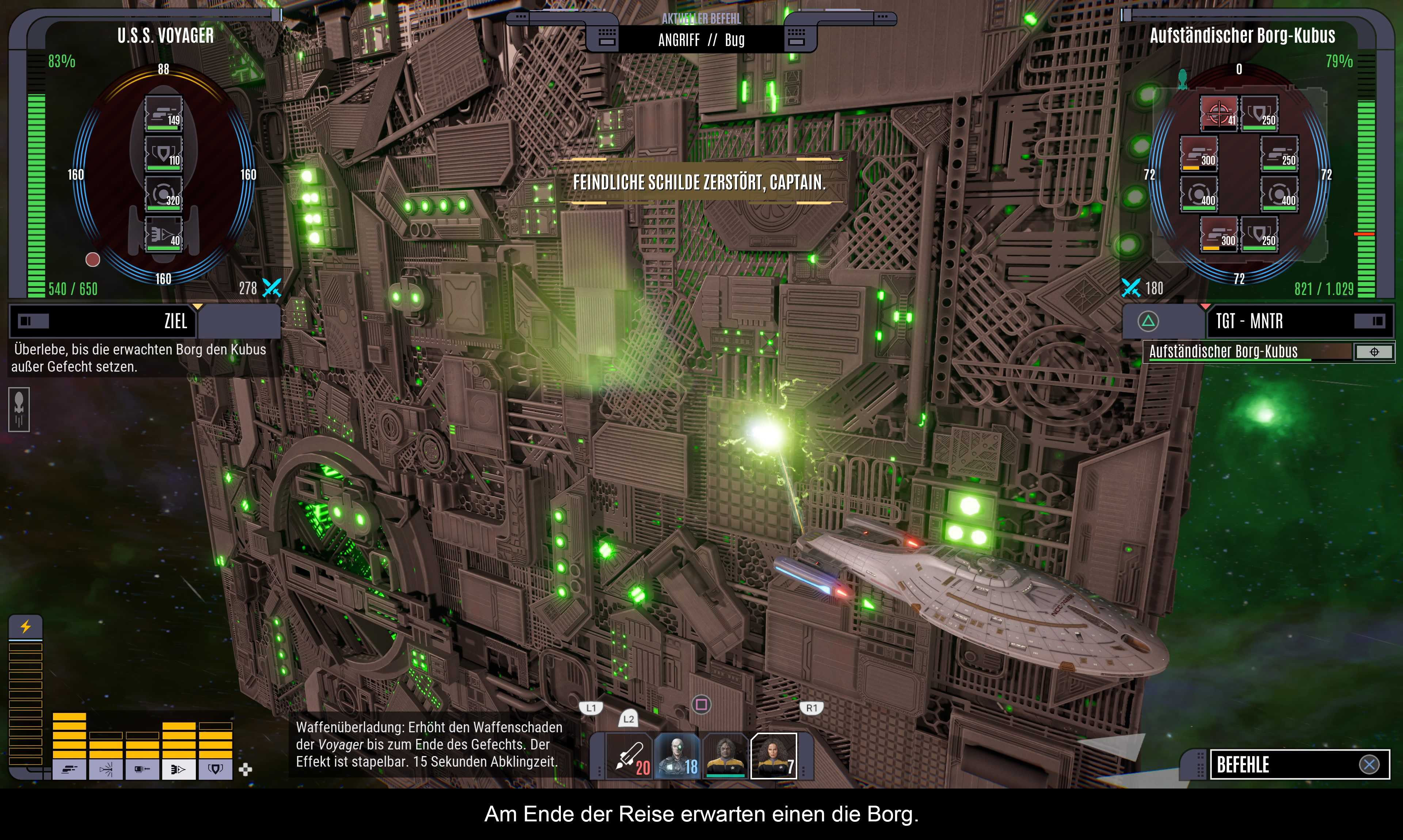 • Weltraumkampf: In diesem Modus wechselt man in einen eigenen Kampfbereich. Die Voyager umkreist automatisch die Feinde und feuert Phaser ab, Torpedos könnt ihr jedoch direkt auslösen. Zu Anfang wählt man auch drei Crewmitglieder mit Kampf-Fähigkeiten, die man effektiv einsetzen sollte und einen Cool Down haben. Da keine direkte Steuerung möglich ist wählt man, ob man sich offensiv oder defensiv verhalten soll. Bei den feindlichen Schiffen lassen sich unterschiedliche Systeme (Waffen, Schilde oder Warp) anzielen. Auch hat man ein Energie Management, um Energie in Schilde oder Waffen zu lenken. Gerade im leichten Modus sind diese Kämpfe keine Herausforderung, dass ändert sich jedoch sehr schnell beim höheren Schwierigkeitsgrad.