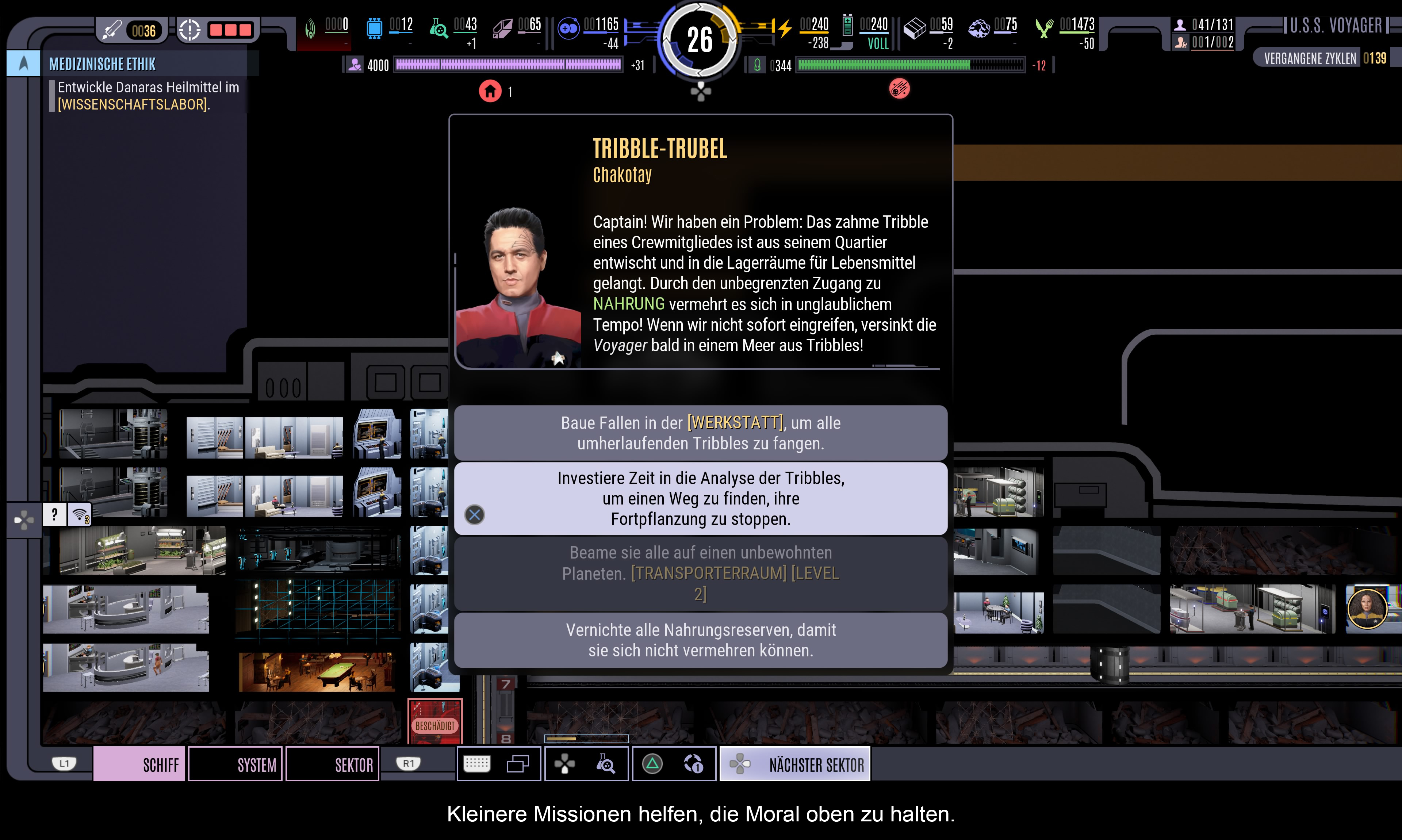 Star Trek: Voyager – Across the Unknown ist ein roher Diamant. An allen Ecken merkt man, dass es von einem unerfahrenen Team erstellt wurde. Der Schwierigkeitsgrad schwankt stark, die Mechaniken sind teils schlecht erklärt und die Präsentation ist mager. Doch schleift man diese Ecken ab, tritt ein unterhaltsames Spiel zutage. Die Entscheidung, die Rahmenhandlung der Voyager mit Roguelike-Elementen im Stile von FTL zu verbinden, war hervorragend. Das Team versteht den Kern der Serie und integriert viele der besten Episoden als Haupt und Nebenmissionen. Auch das man alternative Wege und Lösungen abseits der Serie bietet sorgt für interessante Gameplay Elemente. So habe ich den Doktor gegen Erster getauscht, was zahlreiche Außenmissionen leichter machte. Für meinen nächsten Durchgang überlege ich abseits des Kanons zu wandern und die Oberste Direktive zu ignorieren. Dürfte ein interessantes Experiment werden. Daher kann ich ruhiges Herzen eine Empfehlung für Fans aussprechen aber auch für Taktiker einen Blick wert – aber es hilft deutlich, ein Trekkie zu sein!