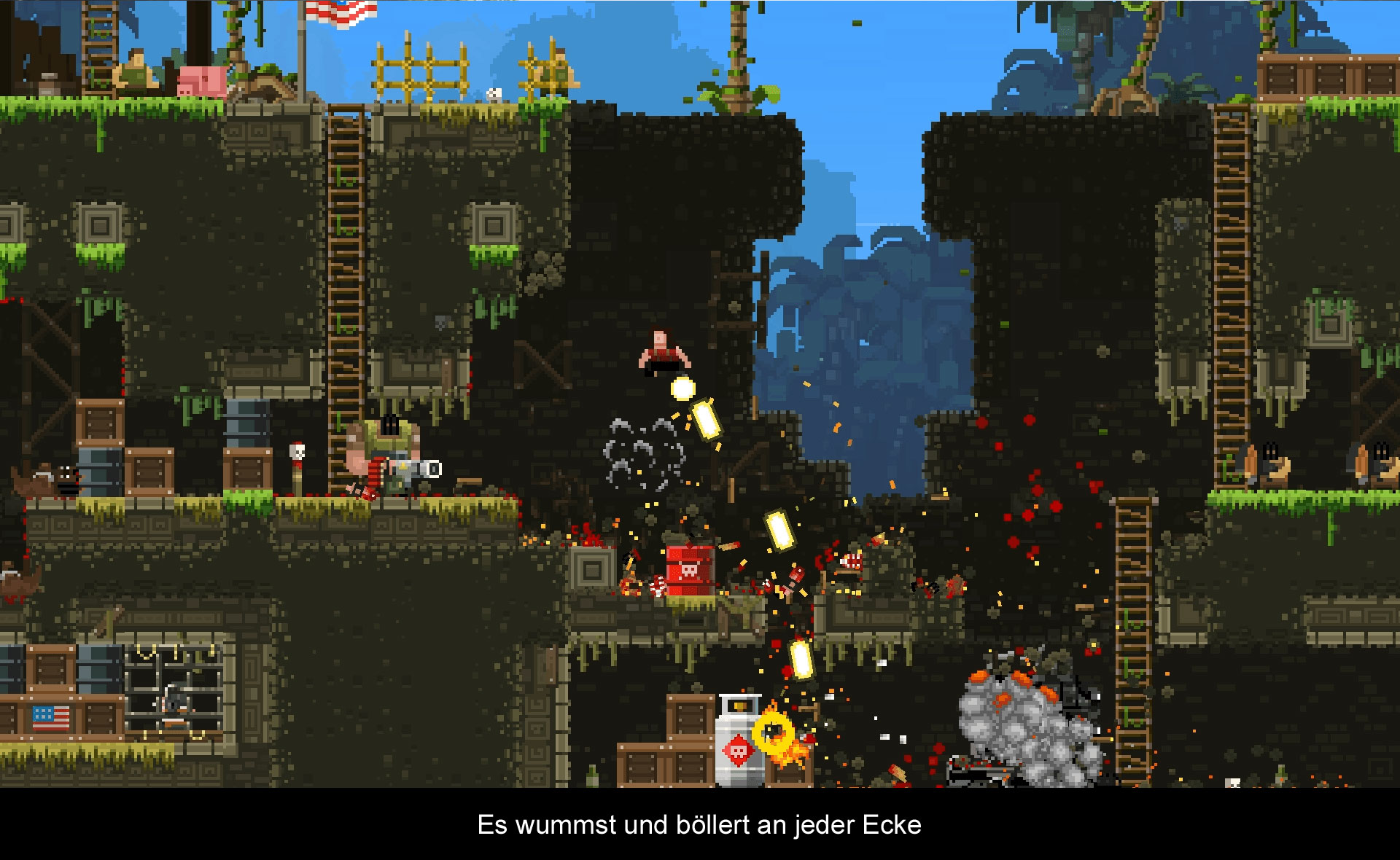 A: Broforce ist ein super brutales, Retro, 2D Action Plattformer, wo du als Hommages an die Actionhelden aus den Filmen der 80er und 90er Jahre spielst, um die Welt vor Terror zu befreien und die Demokratie in die Welt zu tragen.