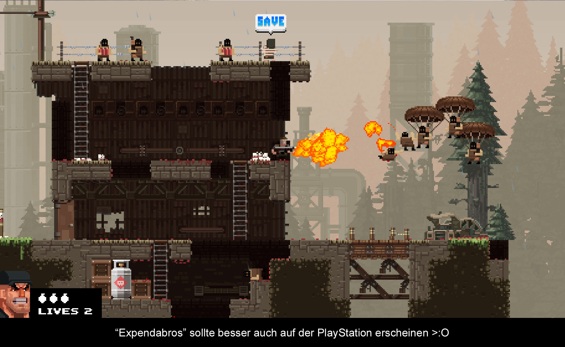 A: Als wir das erste Mal von einem Filmstudio wegen Broforce angesprochen wurden, war es Lionsgate und es ging direkt um The Expandabros. Also war es nicht wirklich ein Problem. Solange ersichtlich ist, dass es sich bei den Charakteren nur um Parodien handelt, dürfen wir sie nutzen. Und da sind wir mit Broforce auf der sicheren Seite.