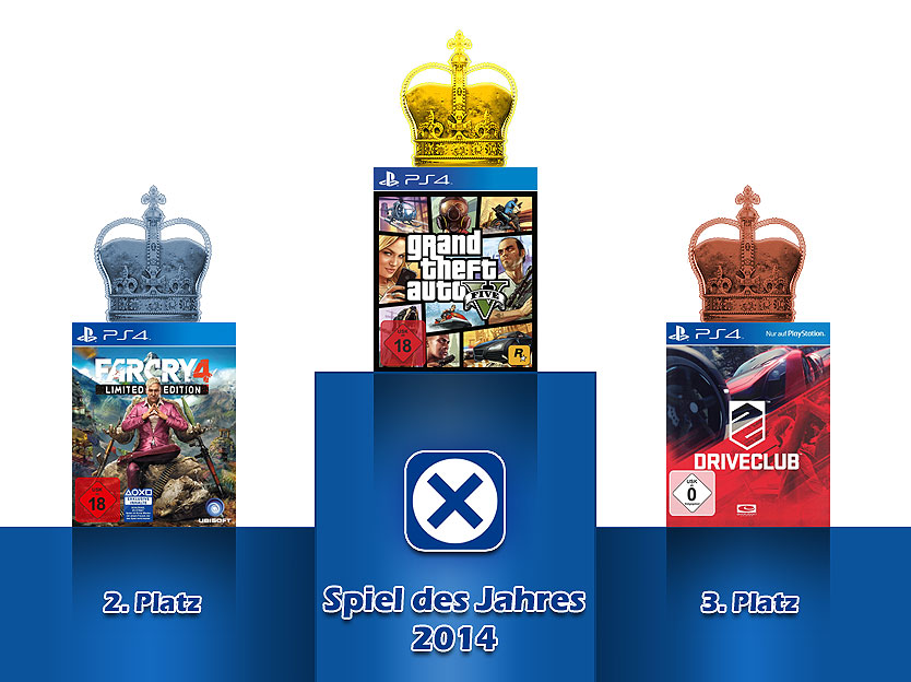 Tada! Das Spiel des Jahres 2014 ist...Grand Theft Auto V für die PS4. Die große Spielwelt und unzähligen Möglichkeiten haben so viele Leute überzeugt, dass es zum Spiel des Jahres gewählt wurde. Natürlich mag manch einer unken, dass der Titel ja bereits in 2013 erschien und bestenfalls ein Port/Remaster ist - aber immer ein tolles Spiel auch auf der neuen Sony Konsole. Mit einigem Abstand folgt dann Ubisofts Open World Shooter Far Cry 4.Aber auch hier könnte man anführen, dass der Titel sich nur wenig vom Vorgänger unterscheidet.Und den dritten Platz sichert sich das Rennspiel Driveclub, dass mittlerweile zu Gefallen weiß, aber beim Launch mit massiven Online-Problemen zu kämpfen hatte.