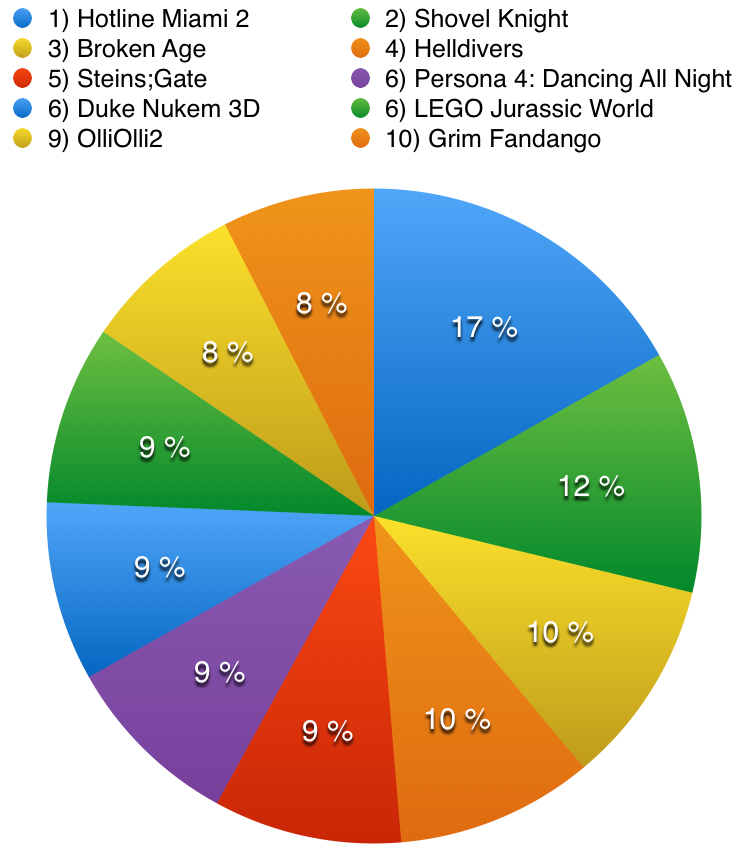 Wie vermutet sind alle Spiele abgesehen vom Sieger Hotline Miami 2: Wrong Number sehr eng beeinander und es haben einzelne Stimme über die Plätze 10-3 entschieden.
